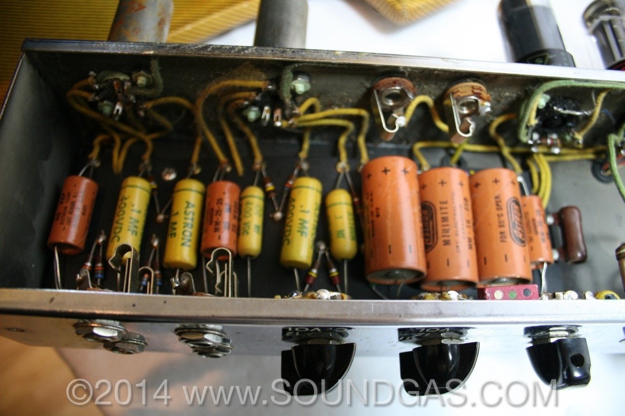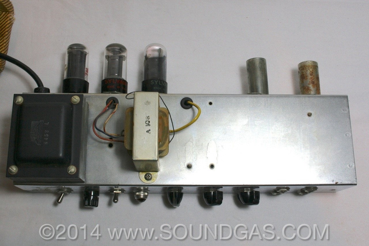 "Cleaned the input jack contacts, tube sockets, and controls; replaced the leather handle with a reproduction as the original was missing; replaced the on bulb and replaced the missing shield on the pre amp tube."
