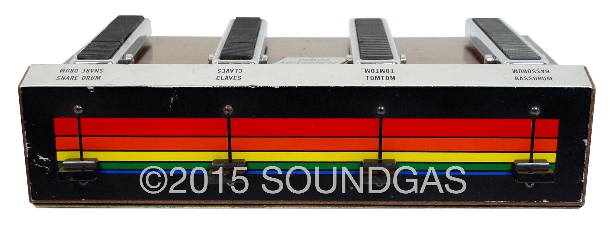 For sale, serviced and in excellent working order and superb condition. This is just a quick listing. We'll post more information and a demo in due course, but essentially you tap the buttons and you get the fat analogue “drum” sound, with the added bonus of being able to set the snare so it rolls and repeats when you keep the pedal pressed. Styling is everything you could want from a groovy bit of 60s kit – faux wood, chrome, rainbow stripes.