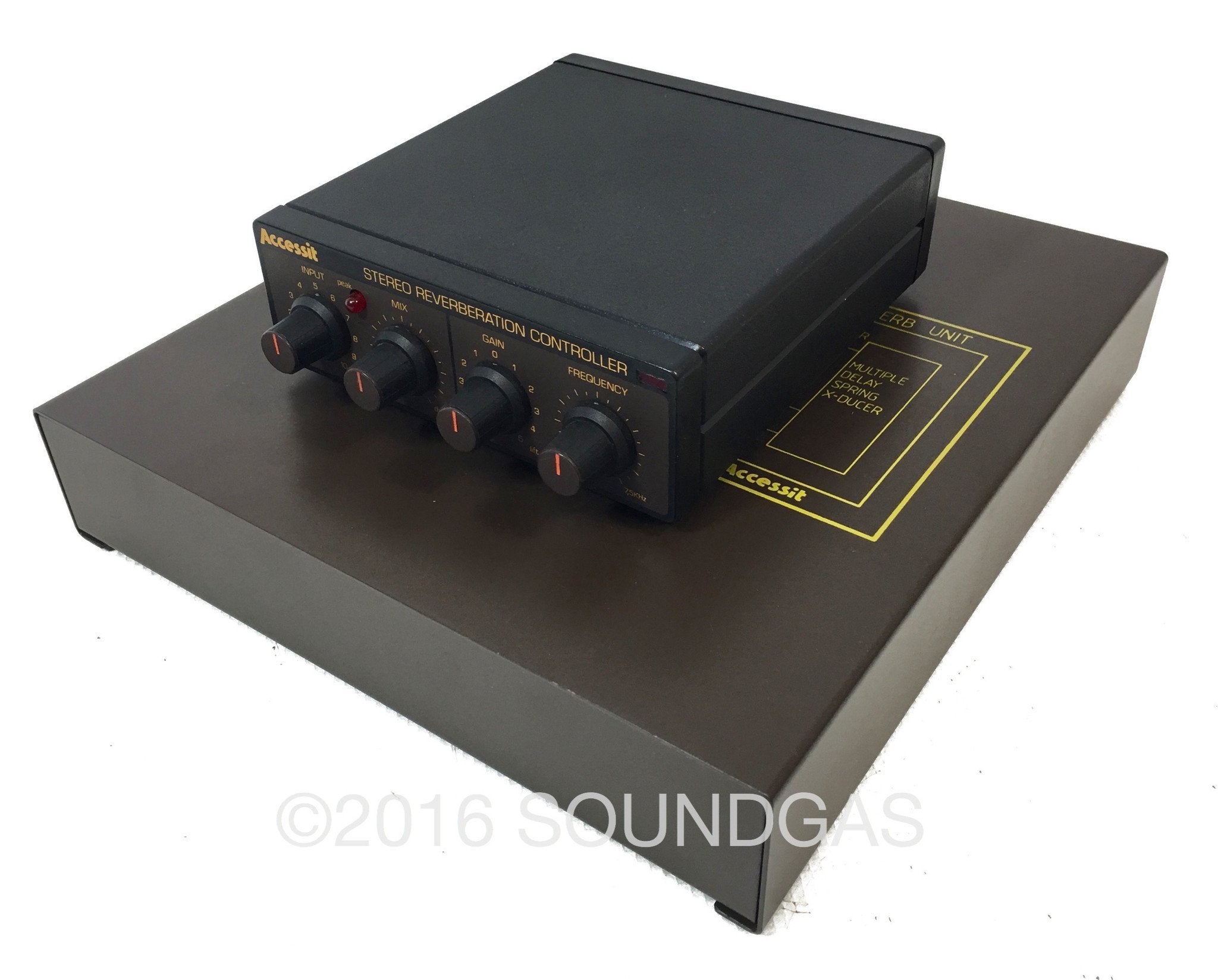 Stunning Accessit spring reverb set-up comprising original boxed Stereo Reverberation Controller, remote reverb tank unit, and a UK 240v power supply, plus connection lead (5 pin DIN from controller to reverb).