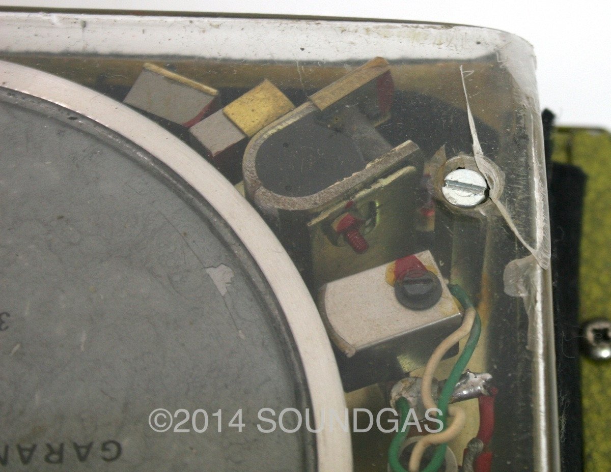 It has been converted to ¼" jack inputs/outputs and the mains socket is now an earthed IEC socket to comply with modern safety requirements. There's some damage to the clear plexiglass cover that protects the disc and heads, but it's still operational. Otherwise there are the usual marks, scratches and oxidation to the painted finish. The front fascia is in superb condition and all the knobs are original and undamaged. An extra input/output have been added on the side and there's a small cut-out on the same side-panel from some previous modification.