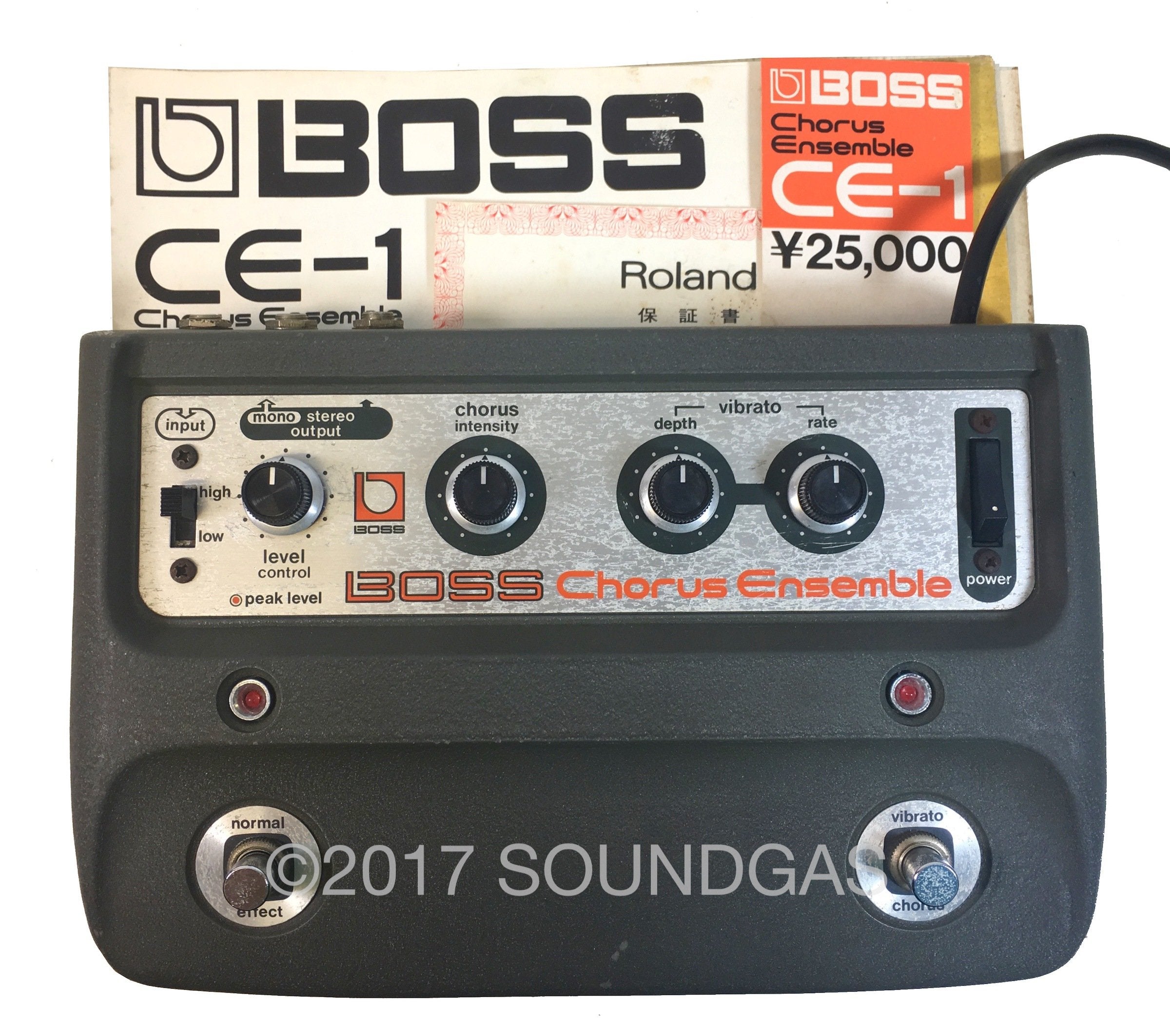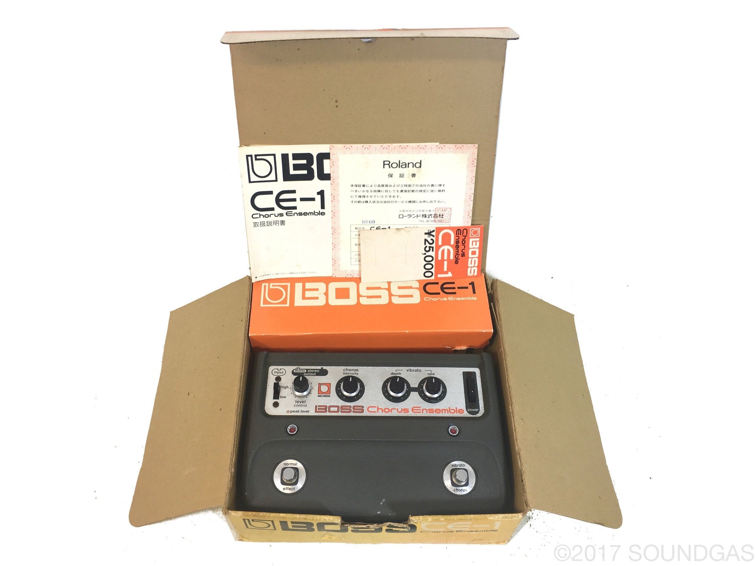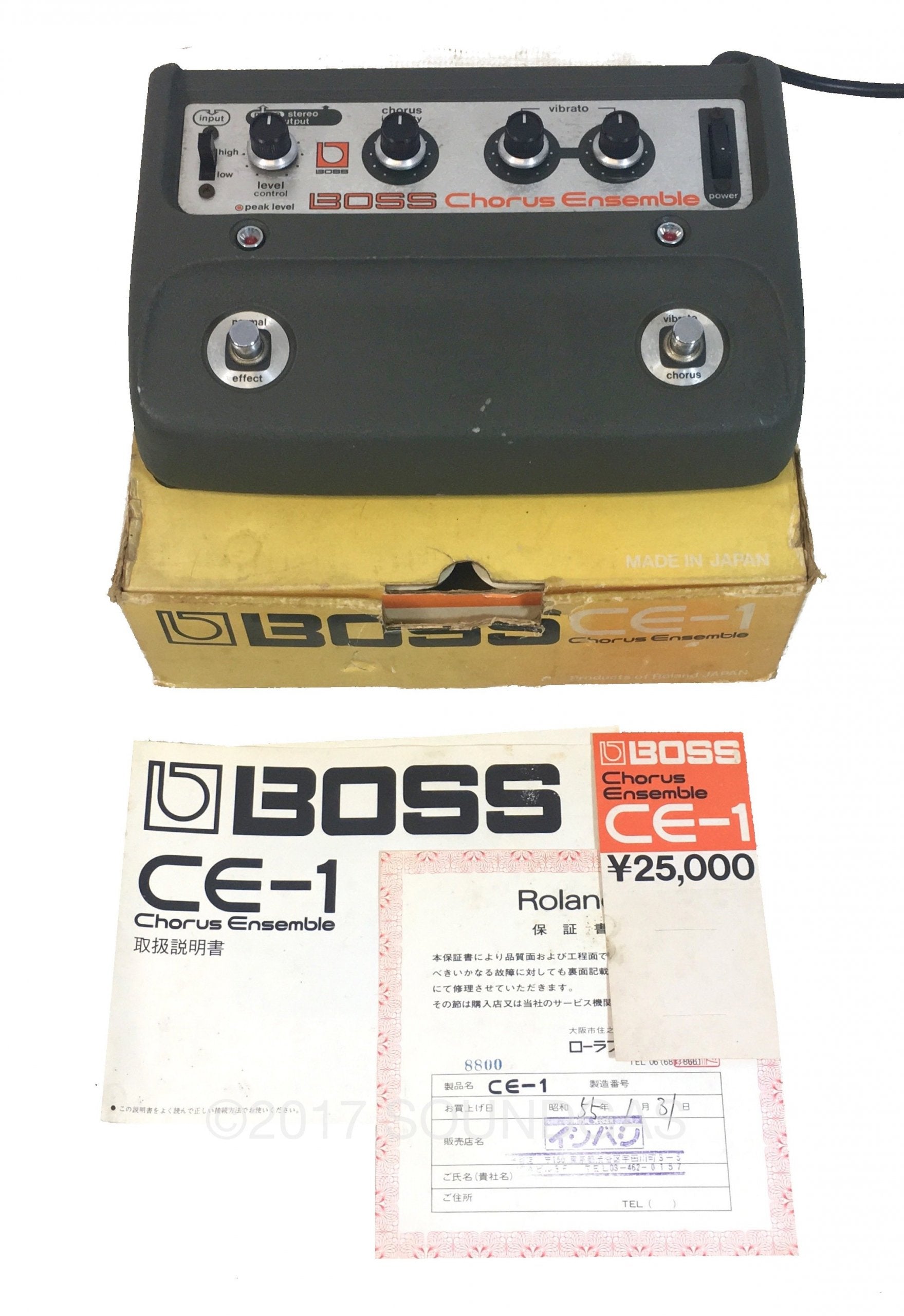 Superb example of a Boss CE-1 for sale in excellent condition with an original box, Japanese manual, warranty card, and even the official Boss price ticket (¥25,000). Serviced and sounding stunning.