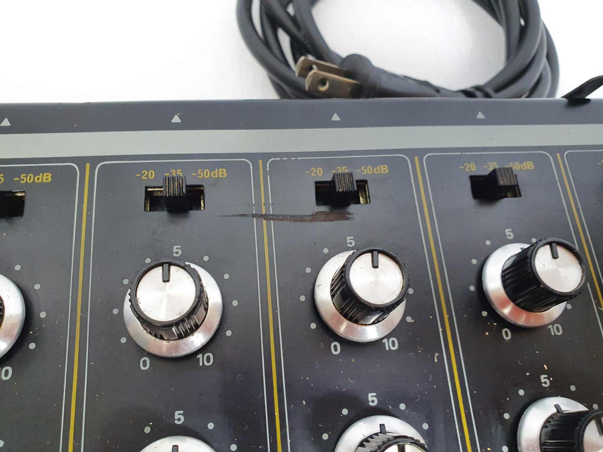 Serviced and ready to ship. Wonderful-sounding, classic brutalist metal stereo 6-channel mixer. This seems to be a KM-6A with the knobs of a 6B…