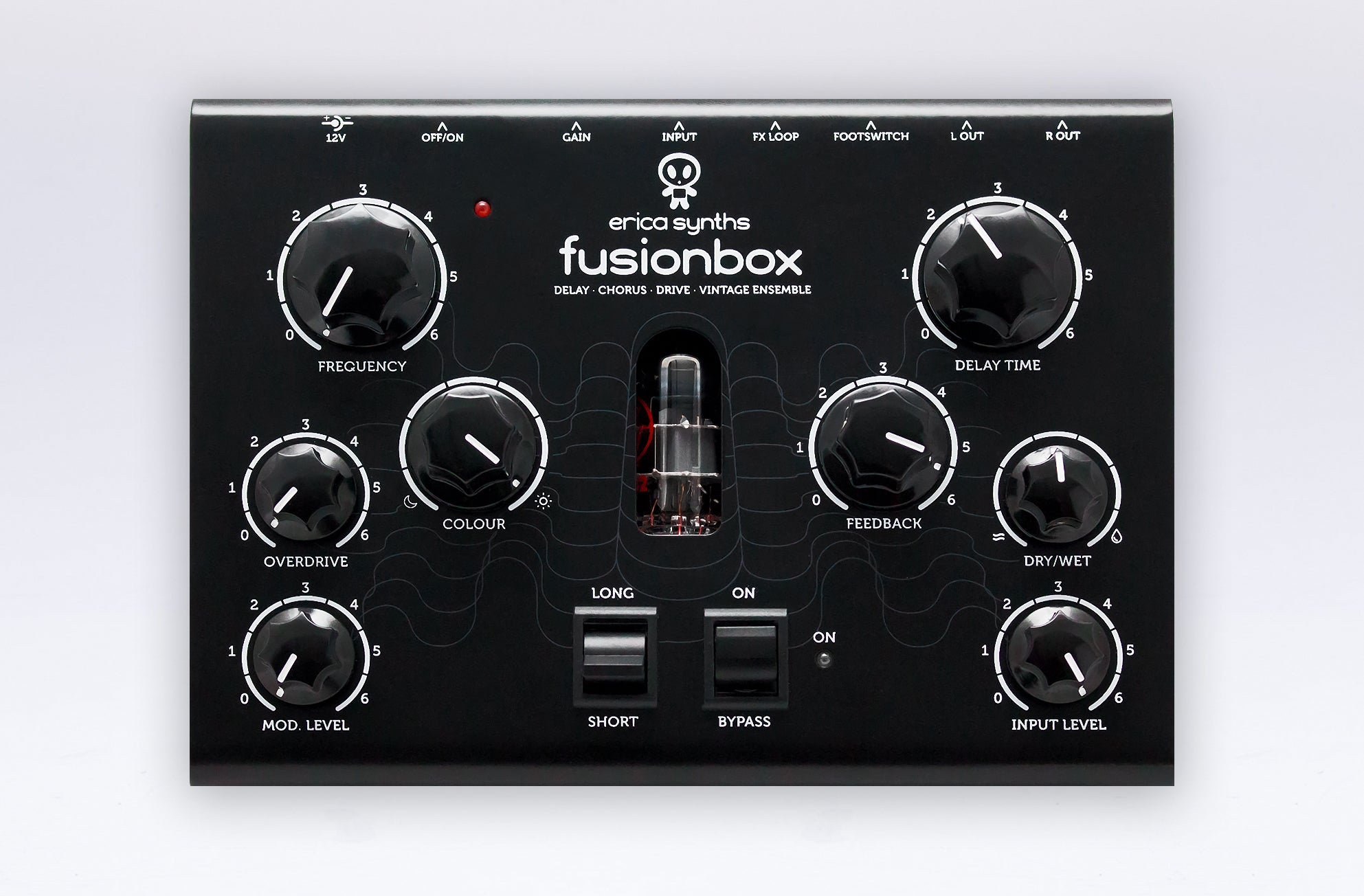 Fusionbox has adjustable input gain, therefore it works with various sound sources – guitars, units with line level signals (synthesizers, grooveboxes, etc.) and modular synths. Footswitch allows to switch on or bypass effects making Fusionbox ideal for guitar players.