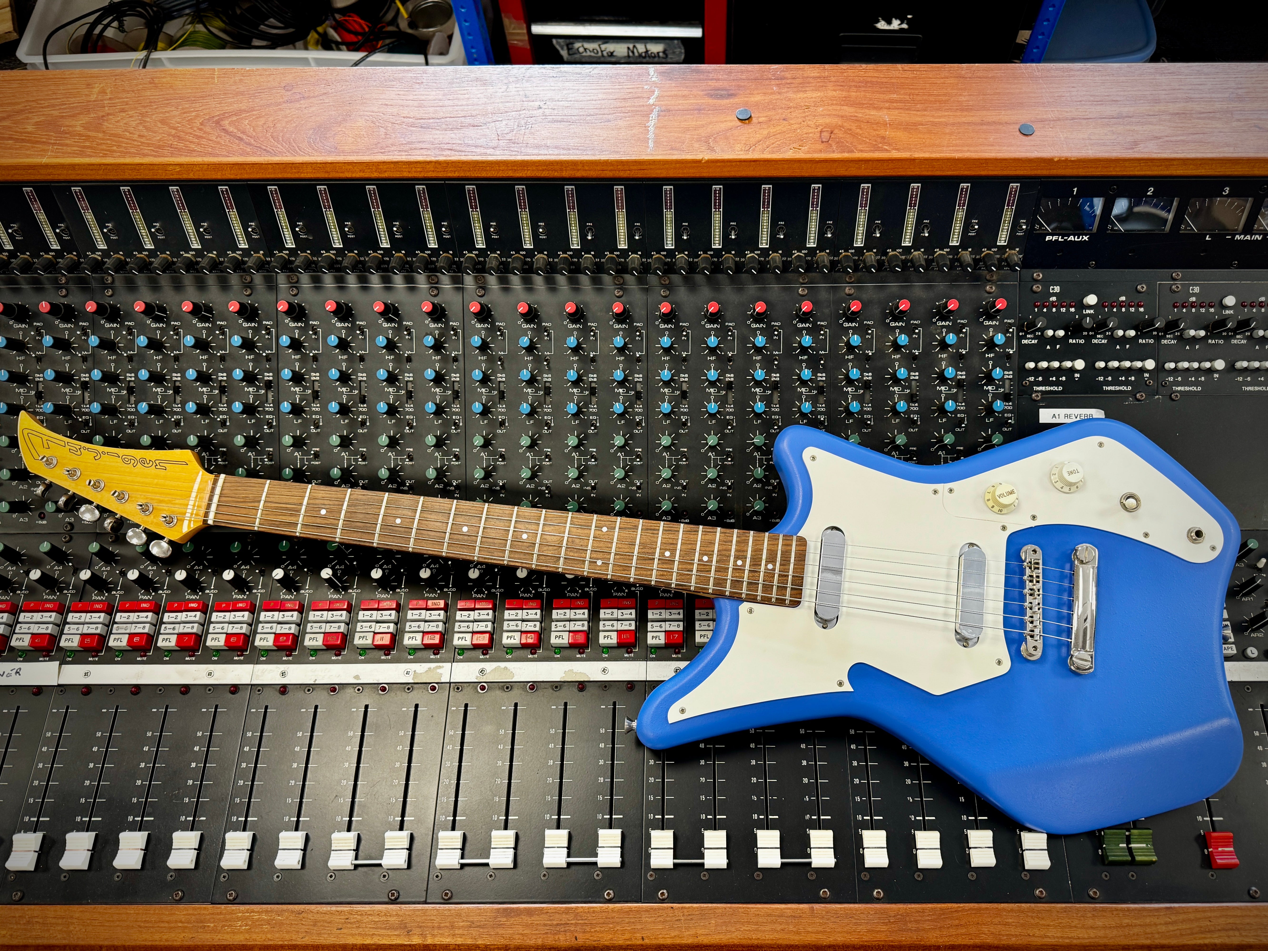 Couldn't resist this cool looking guitar! Dating from the 1990s, it's a Japan-only model by celebrated makers Fujigen and was used/endorsed by Japanese punks, Shonen Knife.