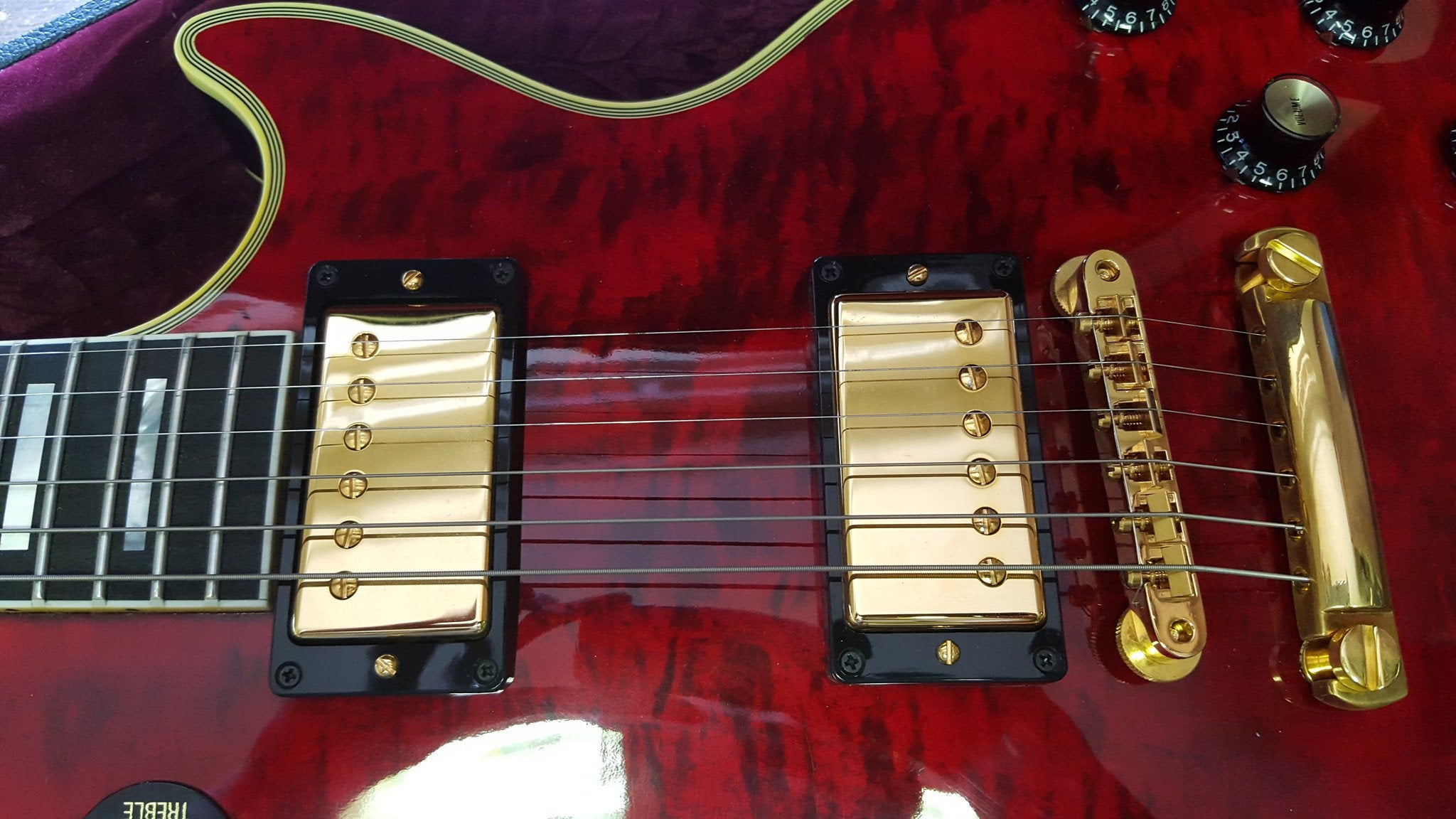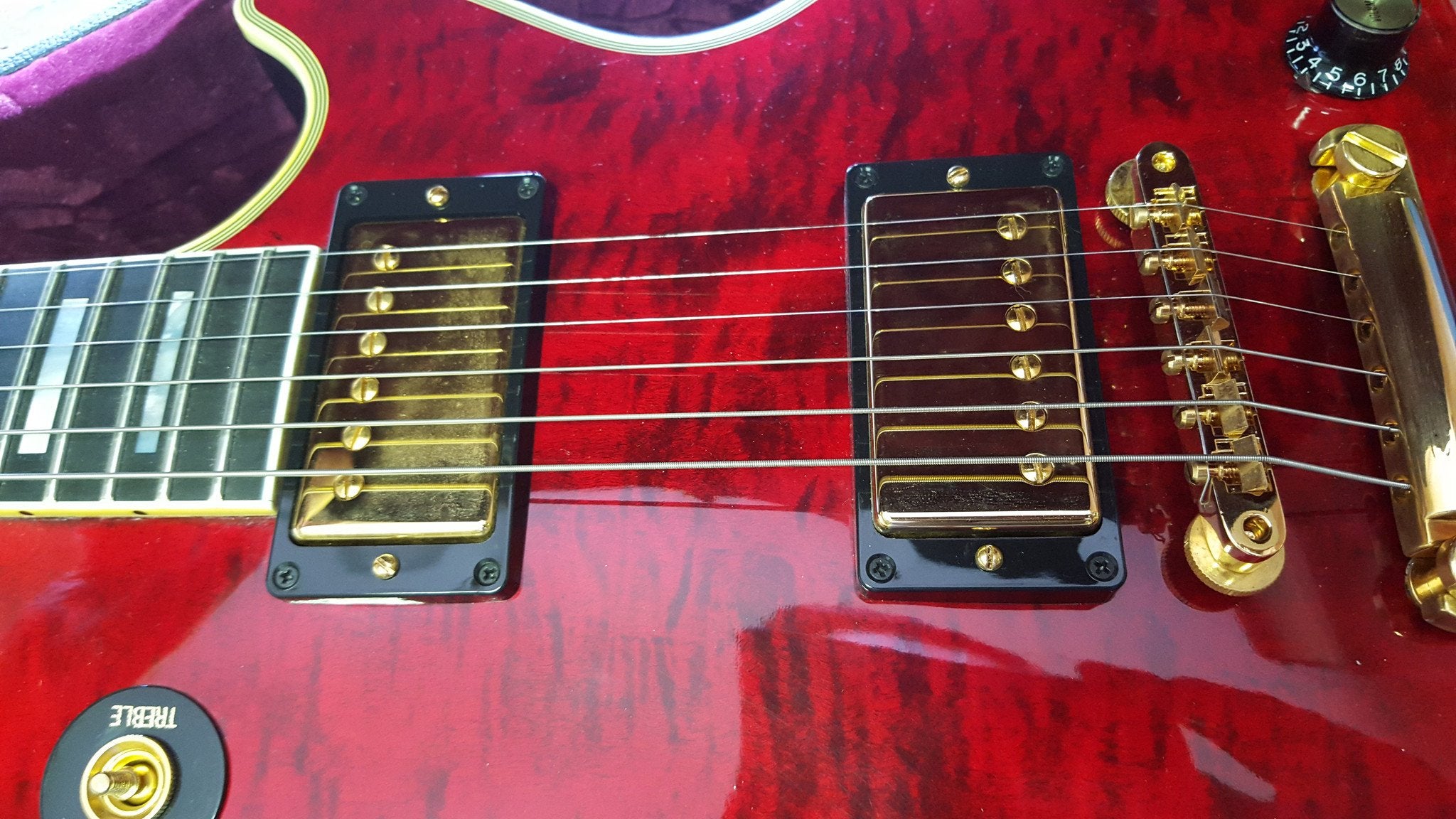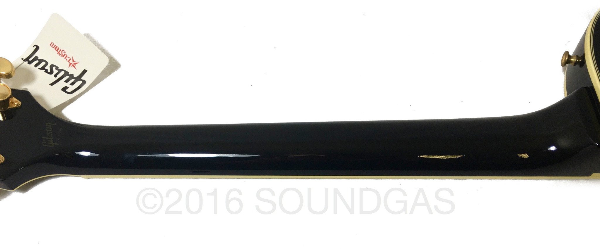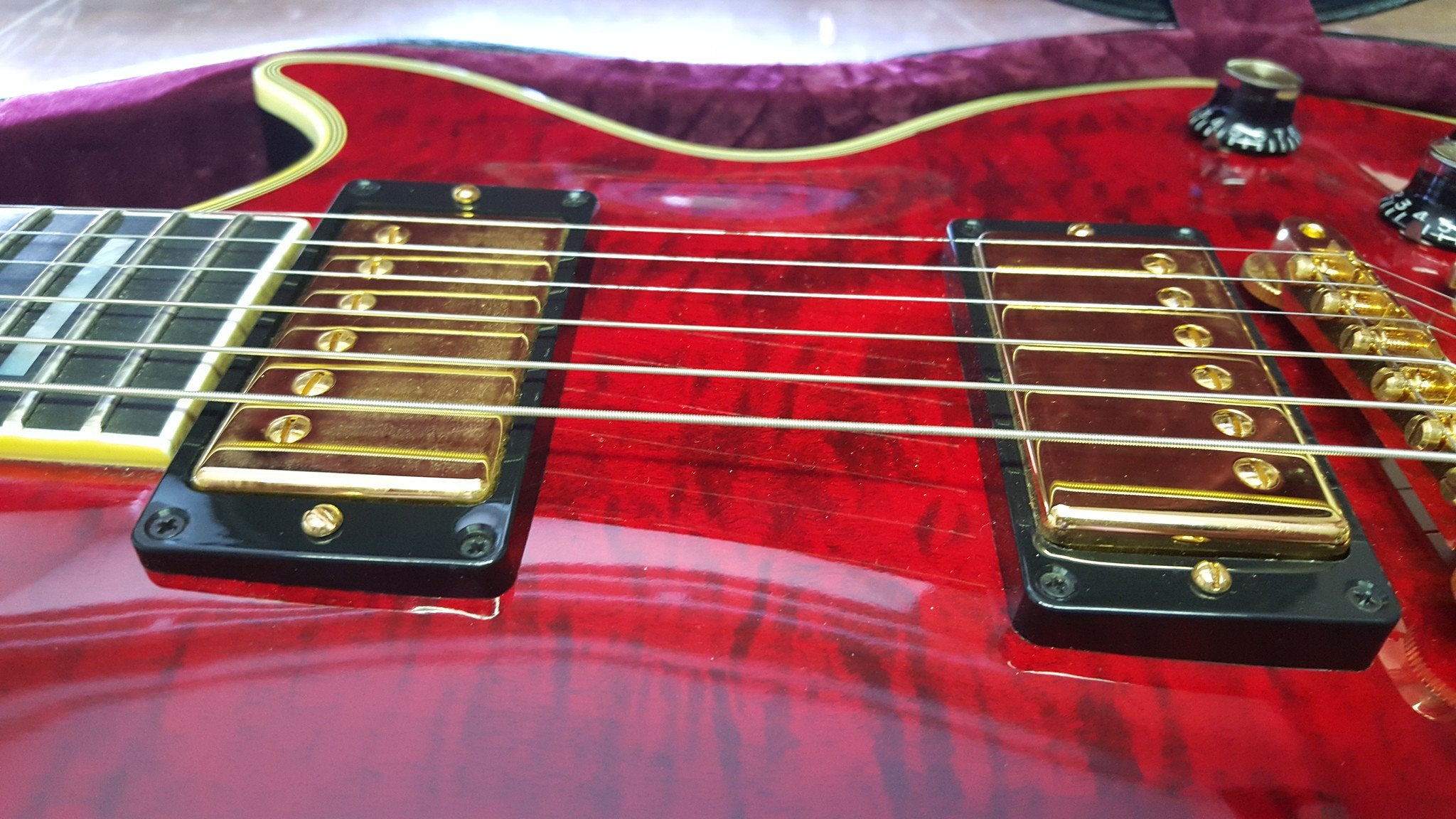 Note that while this guitar is unplayed, it is not the same as one box fresh from the store/factory - you would describe it as "near mint" rather than "mint". It has been stored by the owner since he bought it and over that time some of the metal components have suffered mild oxidation. Apart from the strings (which you would not expect to look like they are fresh out of packet) the flaw that you need to note is that the surfaces of the pick ups are not perfect due to this oxidation. This is not the easiest thing to photograph - please look at the last three images to see how it is only visible at certain angles. (Also please note however that the "mark" visible on the bridge pick up in the third image is just a reflection of the photographer's knuckle.)