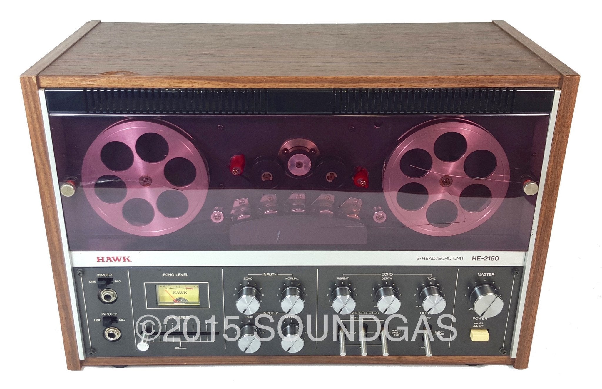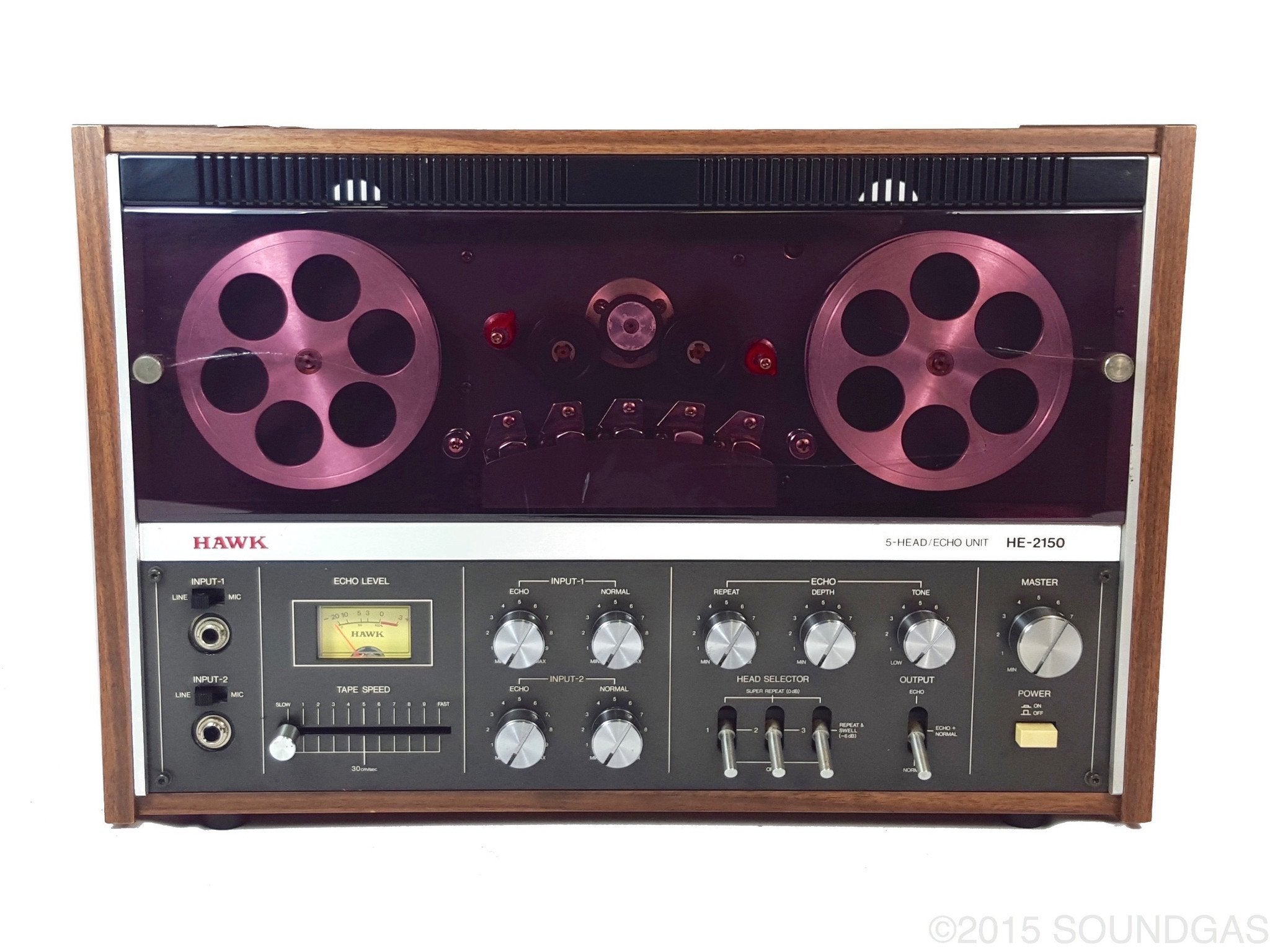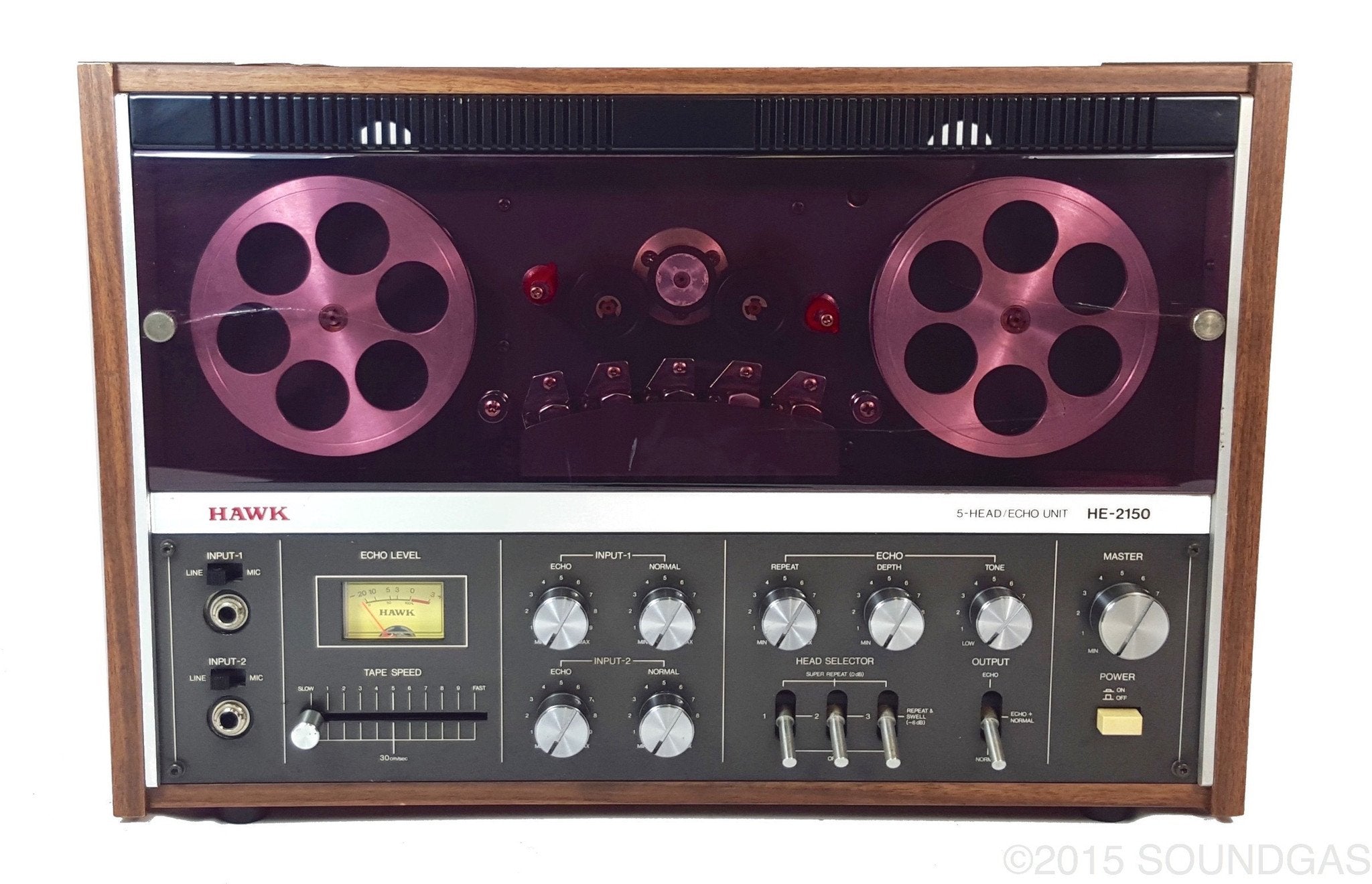Mid-seventies Japanese manufacturer Hawk Technical Works Co Ltd put out a range of tape echoes and spring reverbs branded Hawk/Mirano aimed squarely at domestic home recordists. We were immediately intrigued on first sighting the Hawk HE-2150 open reel style tape echo: even if it sounded bad, it was one of the coolest tape echoes we’d seen. Classic clean seventies hifi styling and backlit vu meter below twin aluminium spools spinning behind the translucent smoked (aubergine!) plastic dust-cover; adds a dose of classic Bond villain lair to any studio…