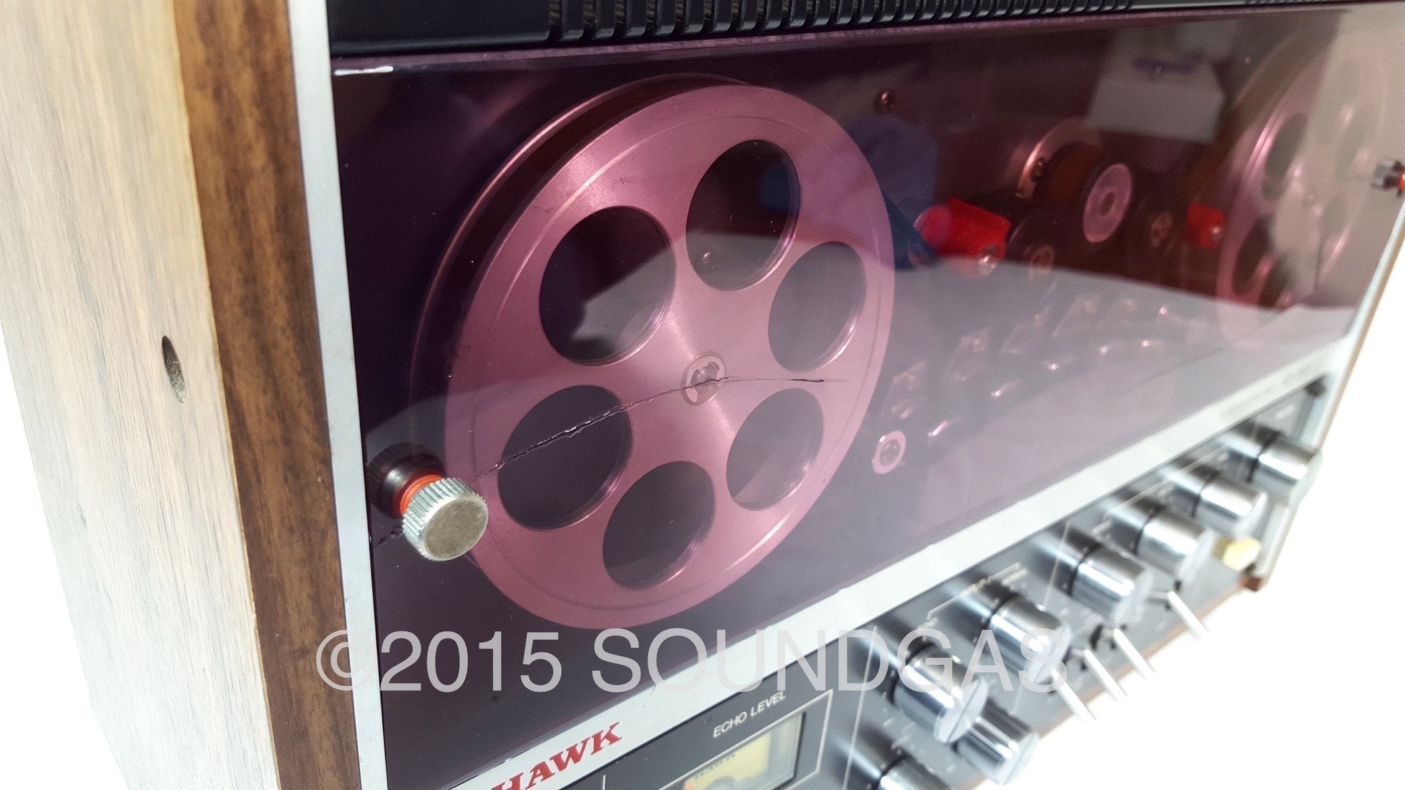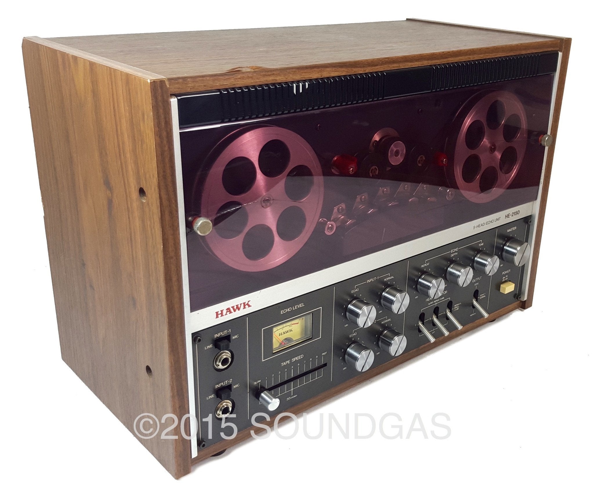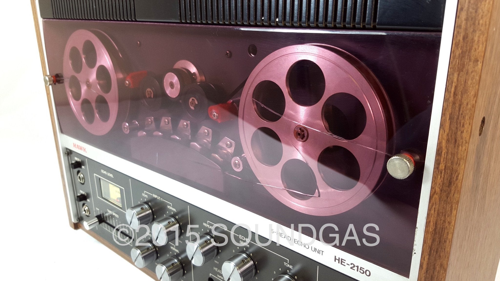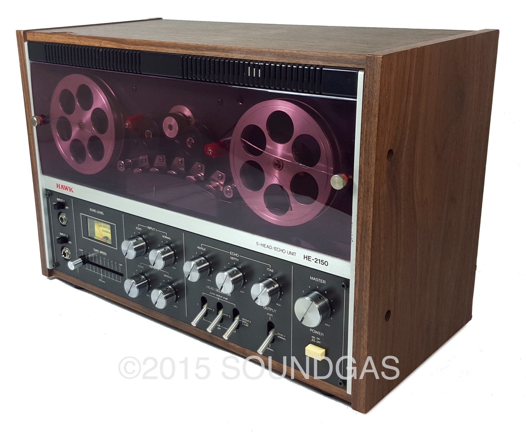Mid-seventies Japanese manufacturer Hawk Technical Works Co Ltd put out a range of tape echoes and spring reverbs branded Hawk/Mirano aimed squarely at domestic home recordists. We were immediately intrigued on first sighting the Hawk HE-2150 open reel style tape echo: even if it sounded bad, it was one of the coolest tape echoes we’d seen. Classic clean seventies hifi styling and backlit vu meter below twin aluminium spools spinning behind the translucent smoked (aubergine!) plastic dust-cover; adds a dose of classic Bond villain lair to any studio…