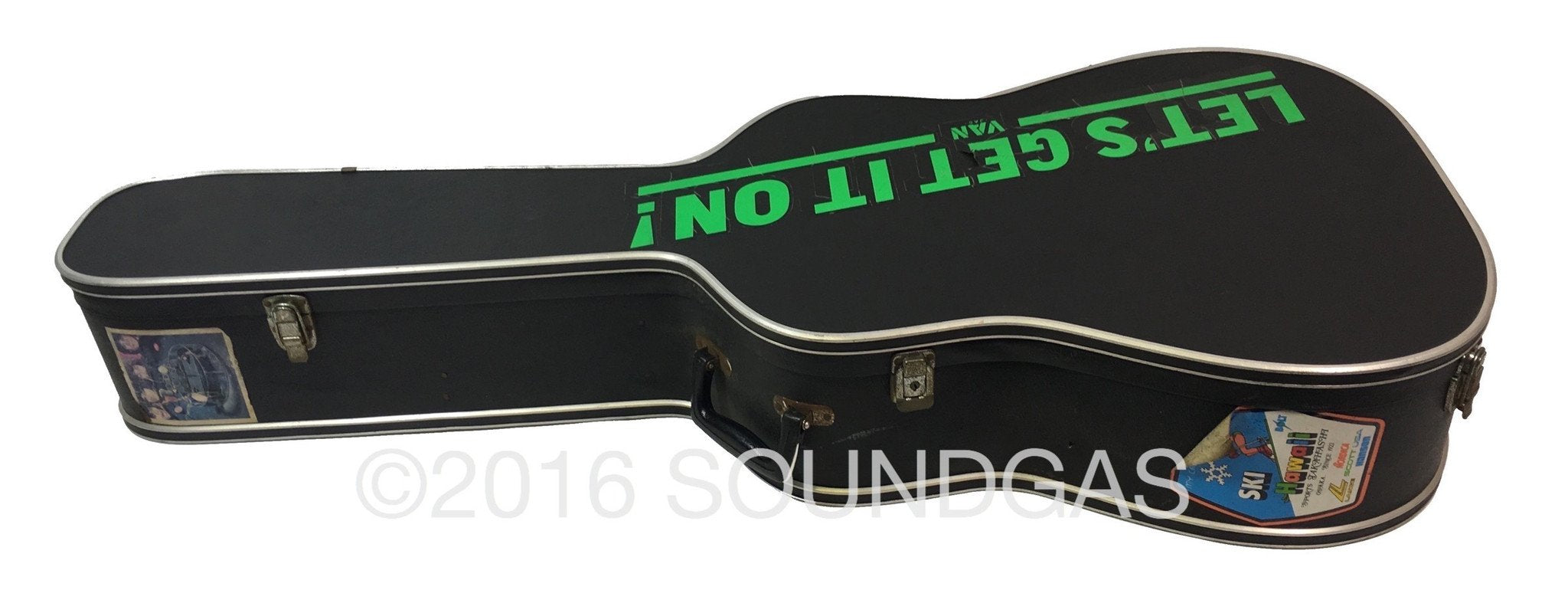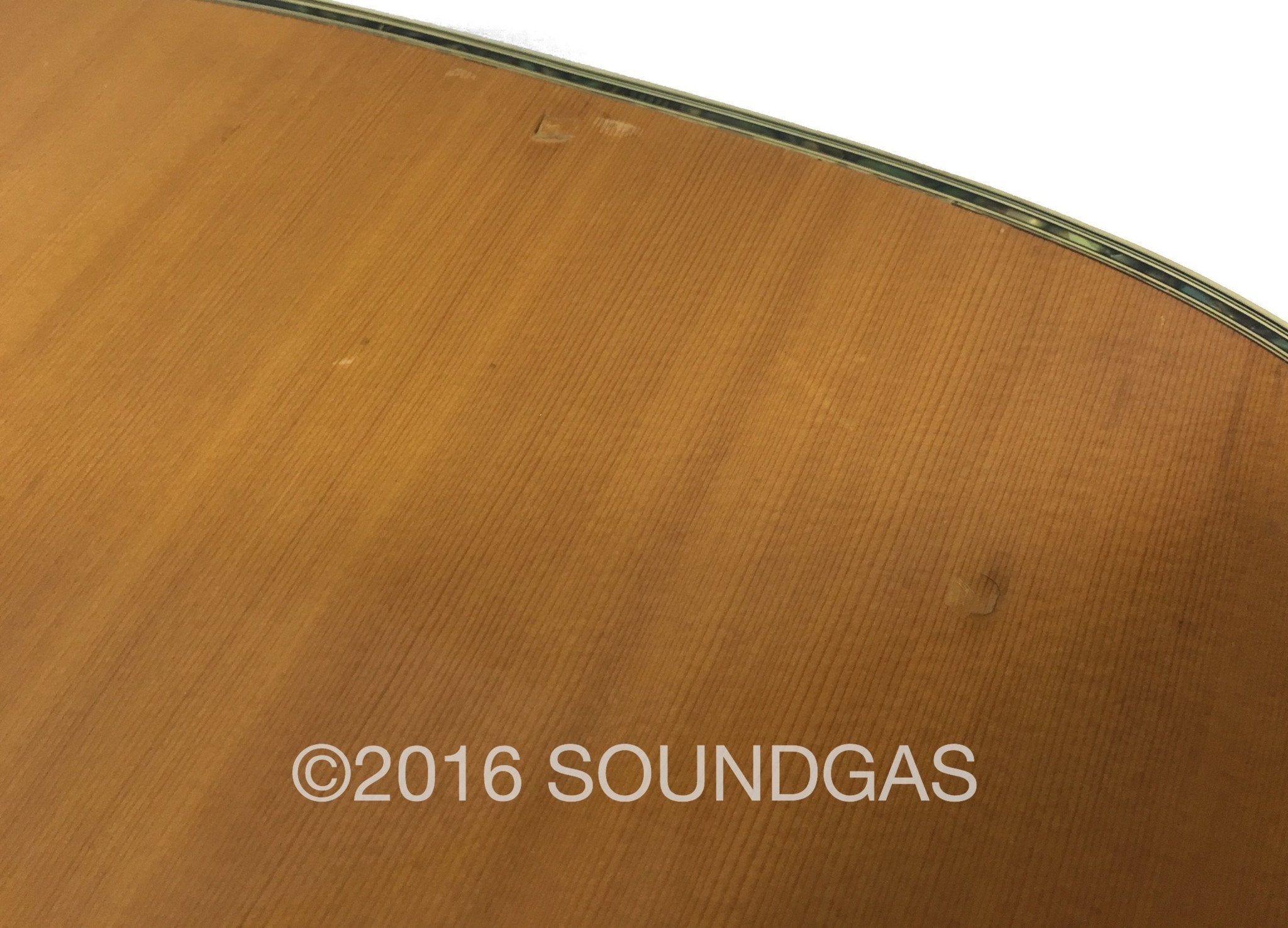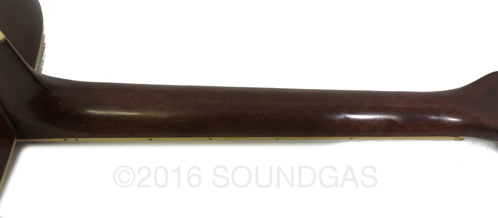 Head is in very good condition with only one or two dings at the very top of the headstock. Neck is in good condition with a few noticeable dings scattered across the back. The body of the guitar is in fair condition, it has some apparent damage on the front shown in the photos and the usual scratches and dings on the back and sides. The bridge has a hole in it behind the pegs where it looked like it has been drilled for some reason. The metal parts of the guitar show signs of age and oxidation.