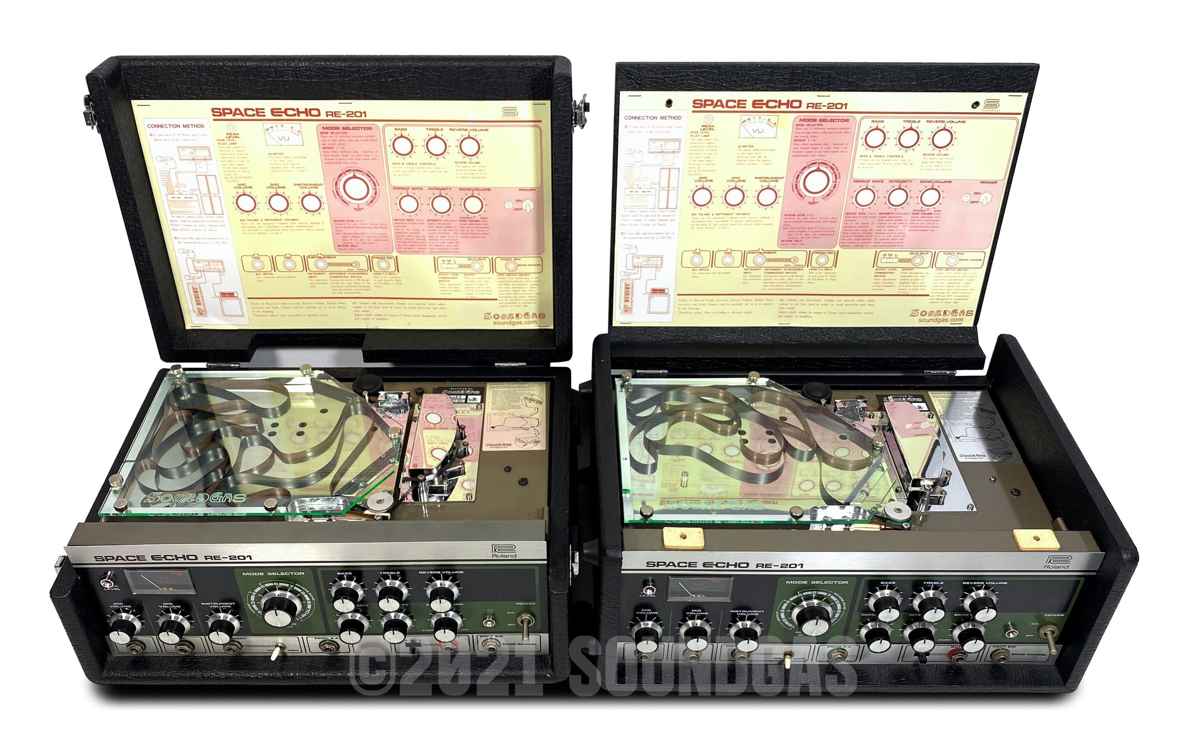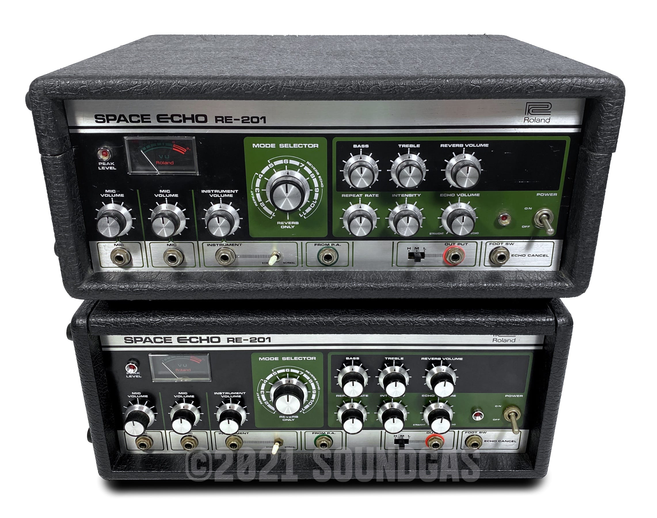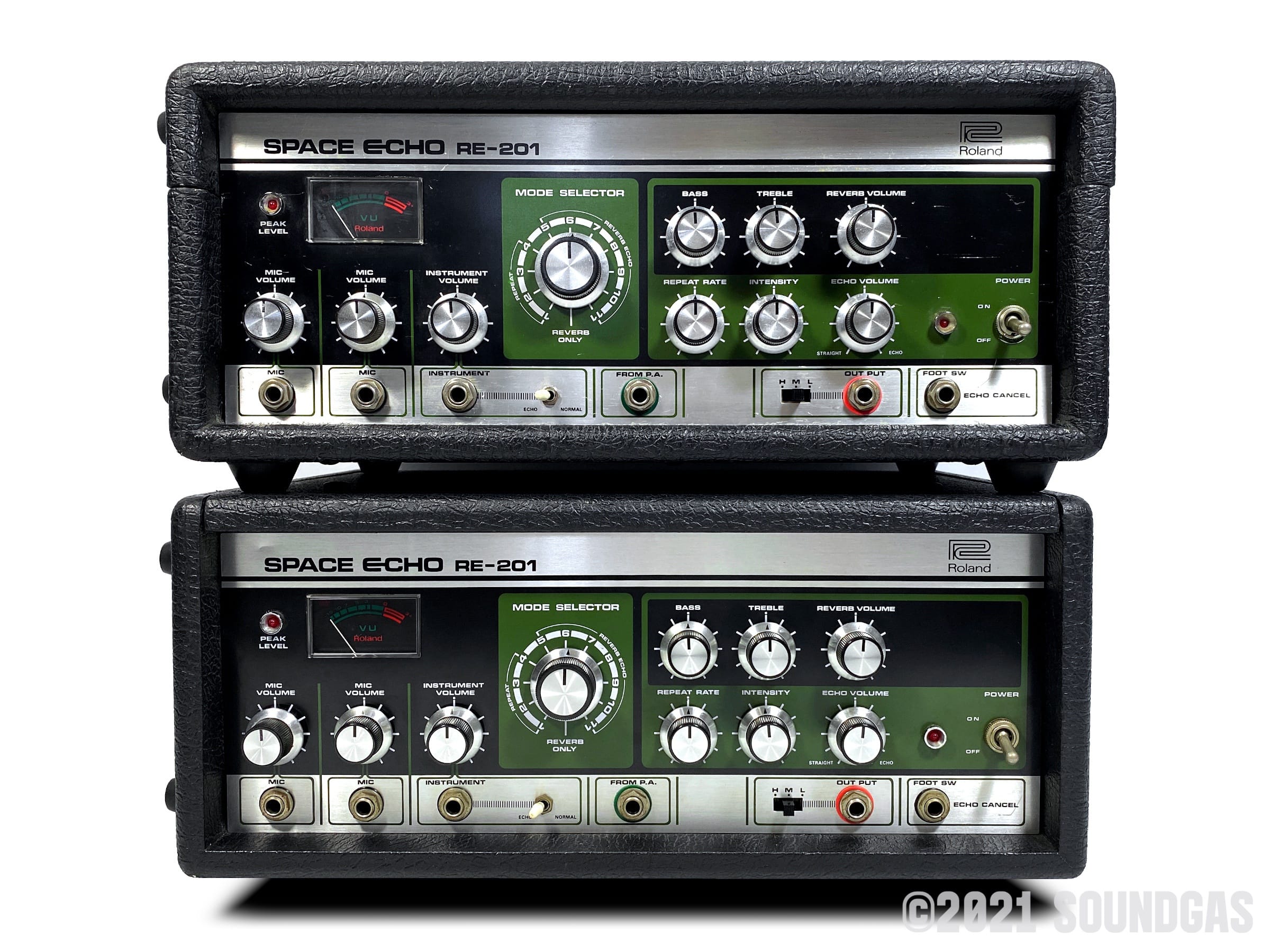 To select and set up two RE-201s that will run well together for stereo use requires exponentially more time than simply servicing two machines. We need a selection of prepared unsold echoes to choose from to begin with (which does not often happen). The variations in components and age over many years' (and four factories) production makes for a surprisingly wide range of performance between machines that all carry the RE-201 name.