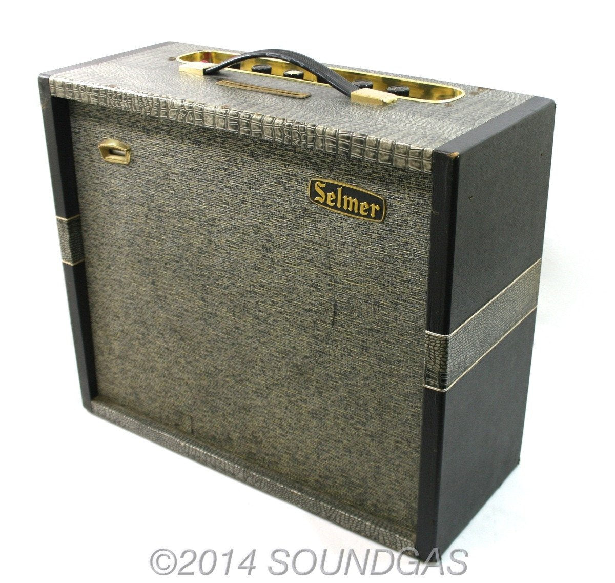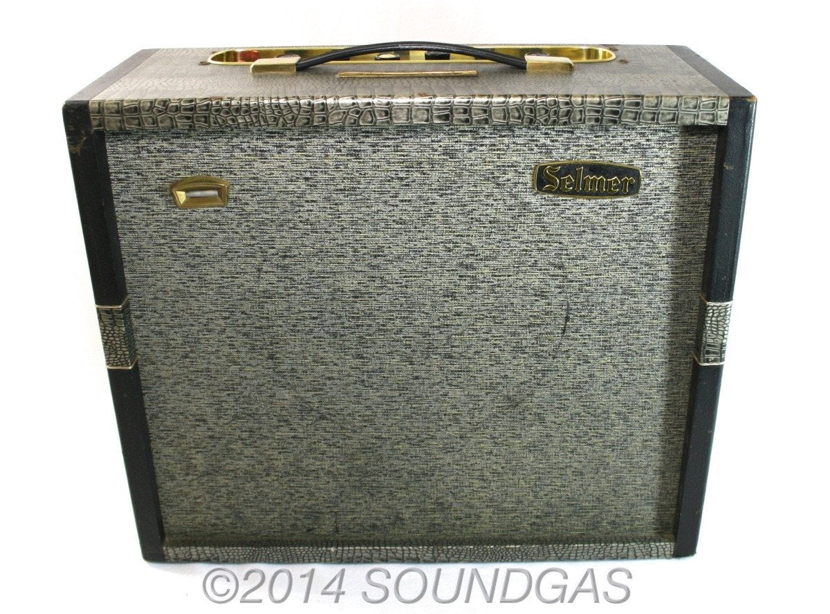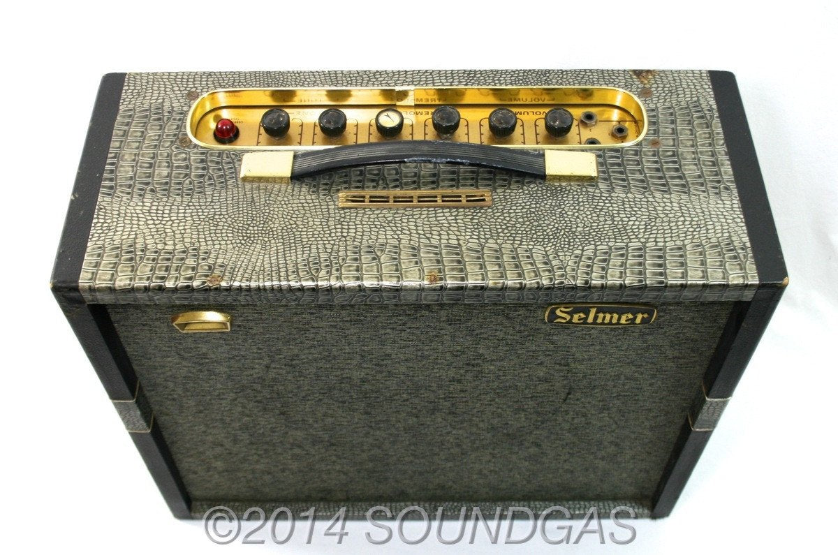 In very clean condition, just back from a full service. Sounds lovely - this is the cosmetically-enhanced (with croc skin finish) and renamed model that followed the earlier Stadiums, famously-used by the Beatles in their Hamburg days, and also by the Shadows as their main amp pre May 1960. Giving a respectable 14 watts output, this amp includes the original footswitch for the tremolo - with blinking eye indicator on the front of the amp. All major internal parts are original, many minor components required replacing (included). Tubes: EF86 (3), ECC82(1), ECC83 (1), EL84 (2) and EZ81 (1). Goodmans Audiom 60 12" speaker in good order. A few obligatory cigarette burns to the top and missing some of the gold inserts from the control knobs, but otherwise a very good example.
