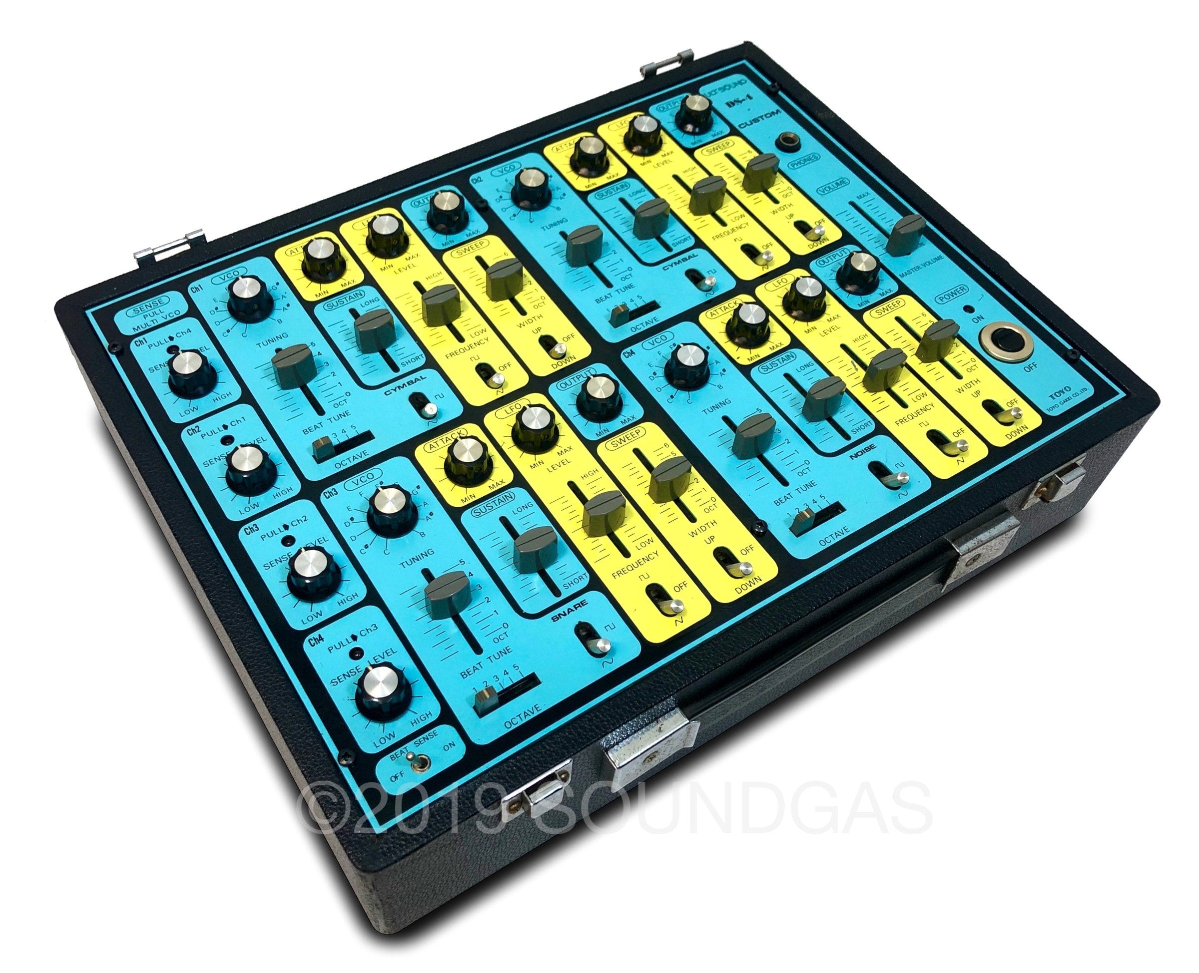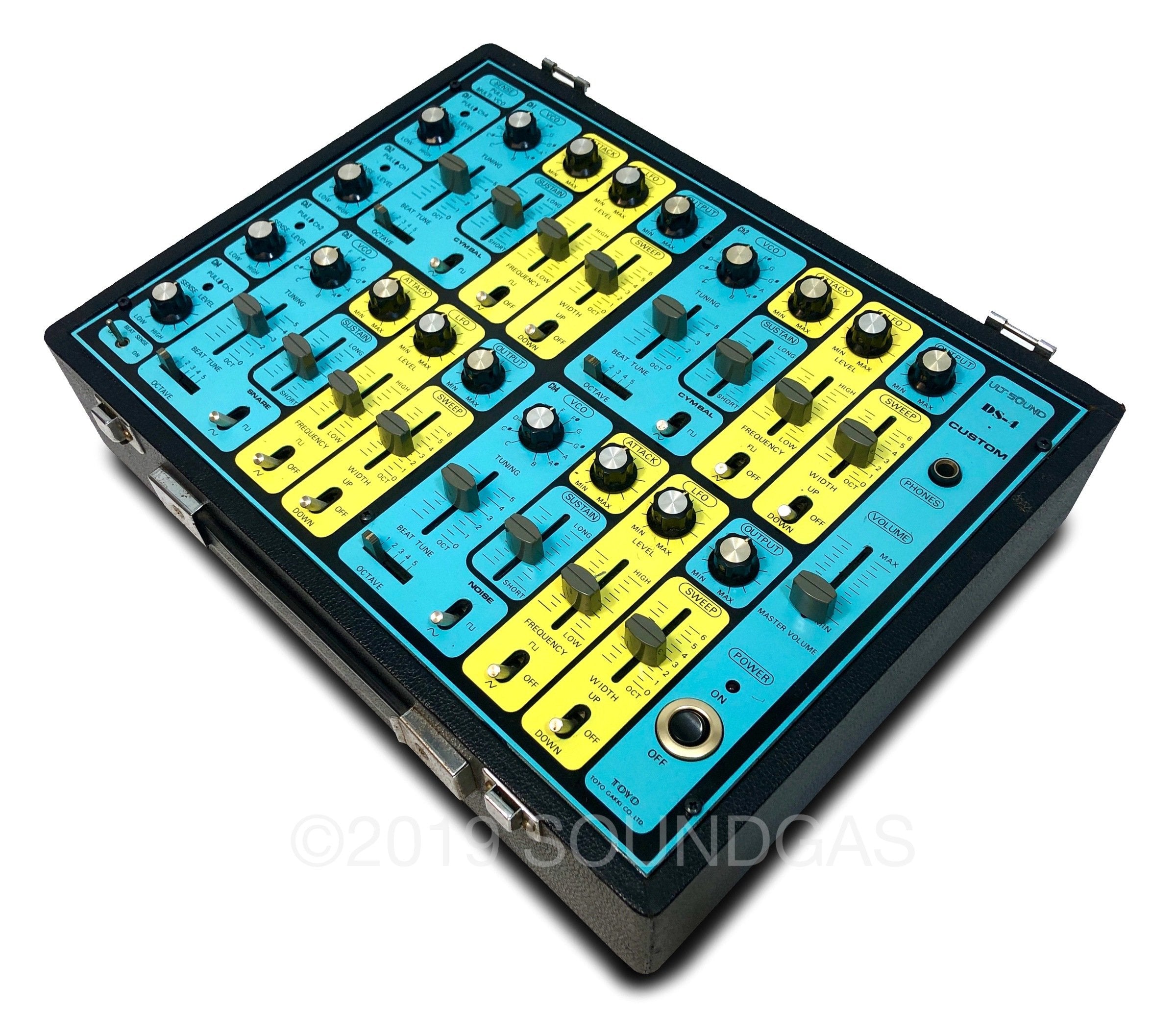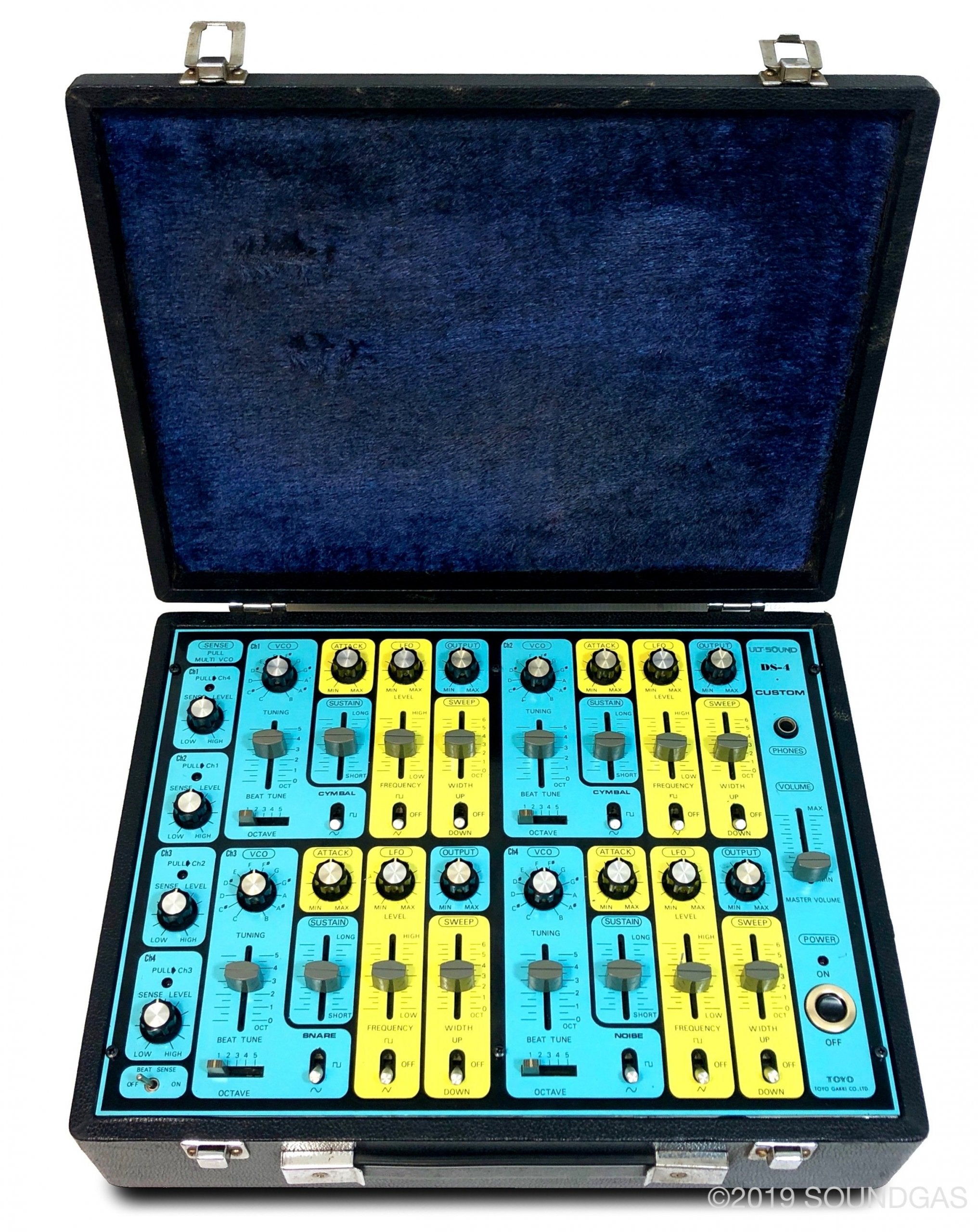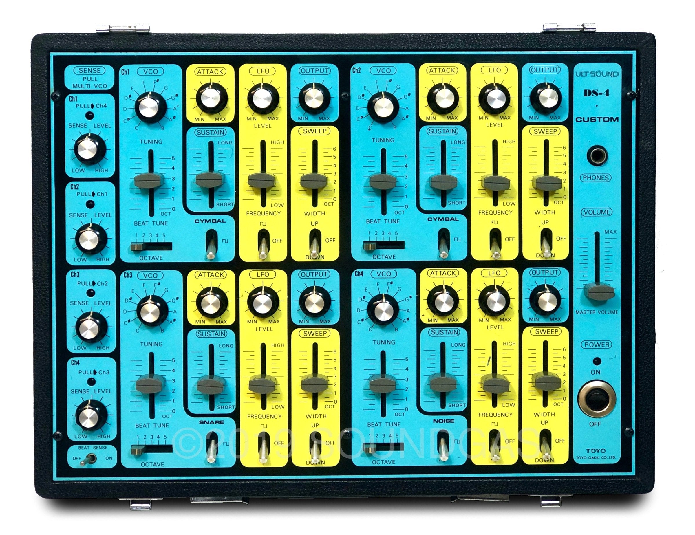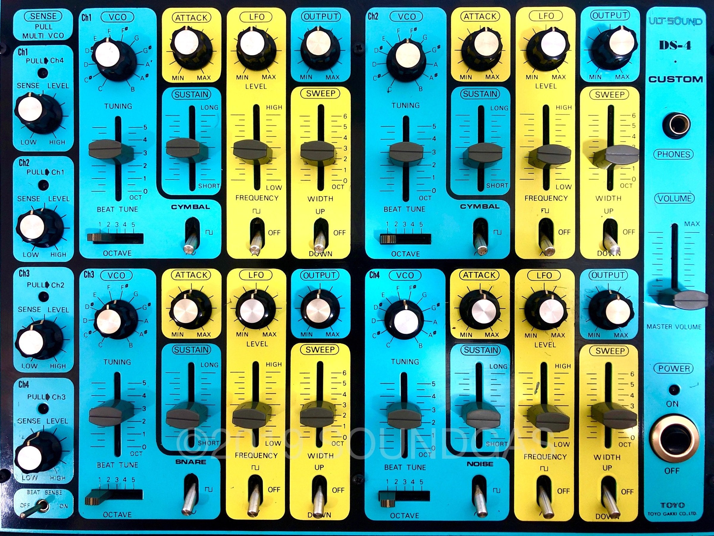 Ultra-rare Japanese 4 channel drum synth with unique cascade triggering option – accessed by pulling individual channel sensitivity knobs.