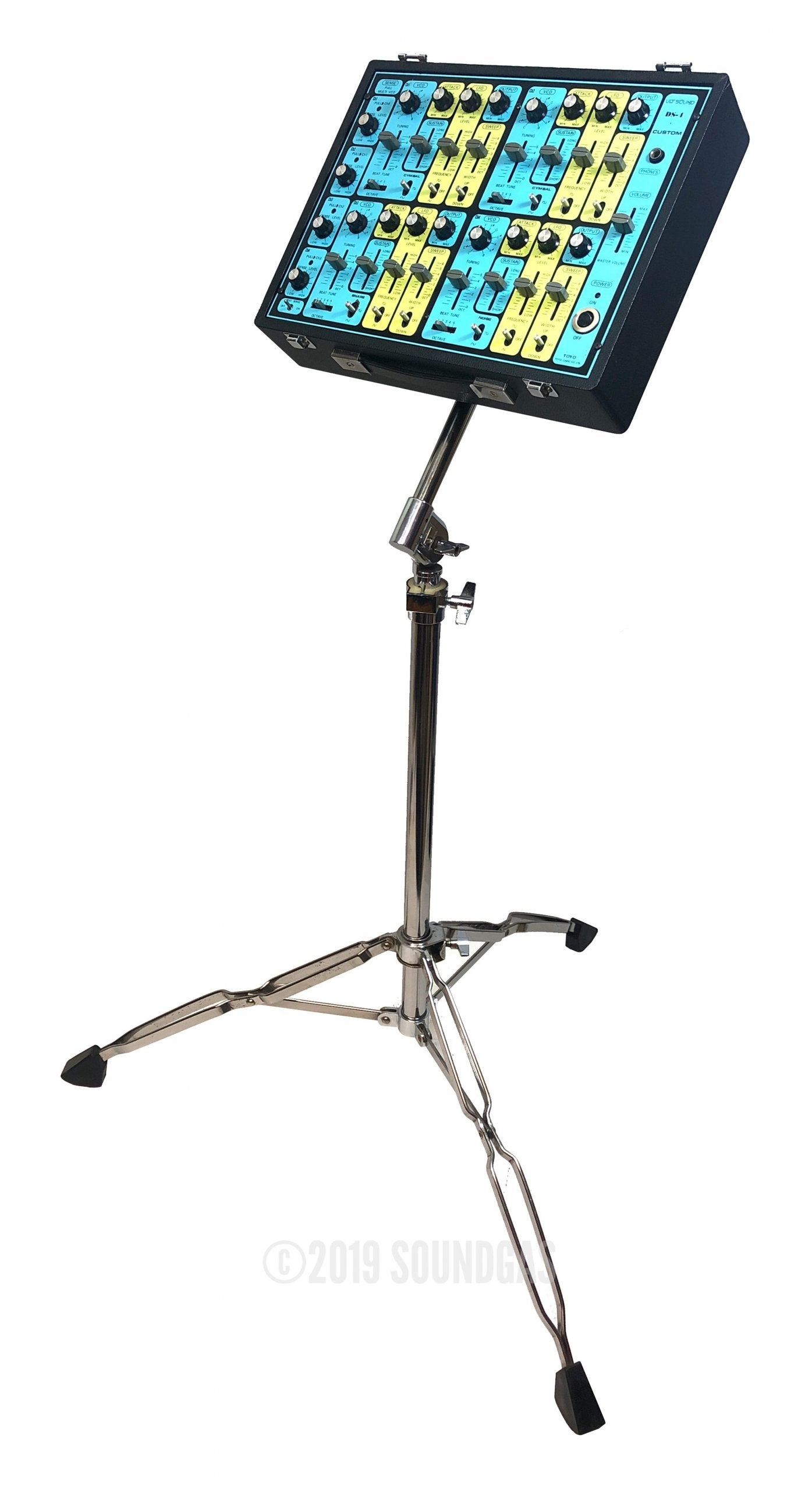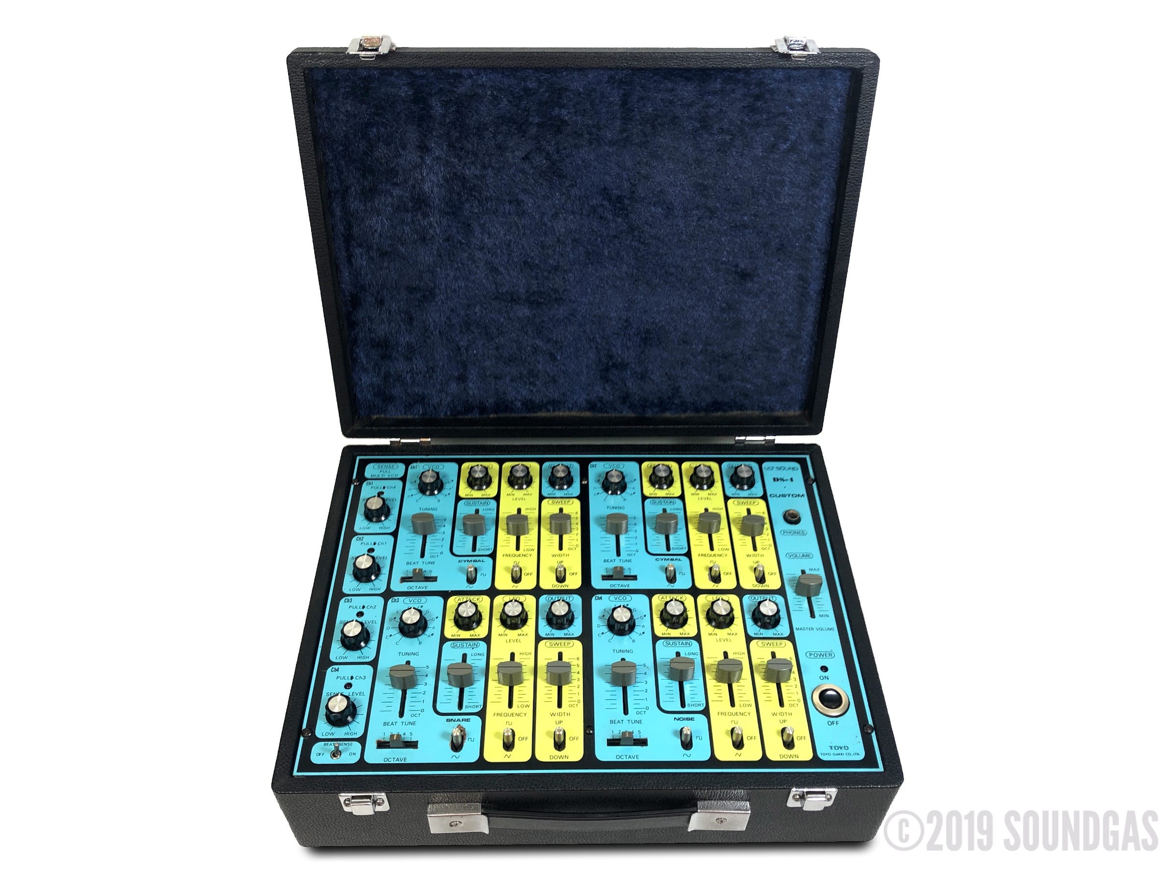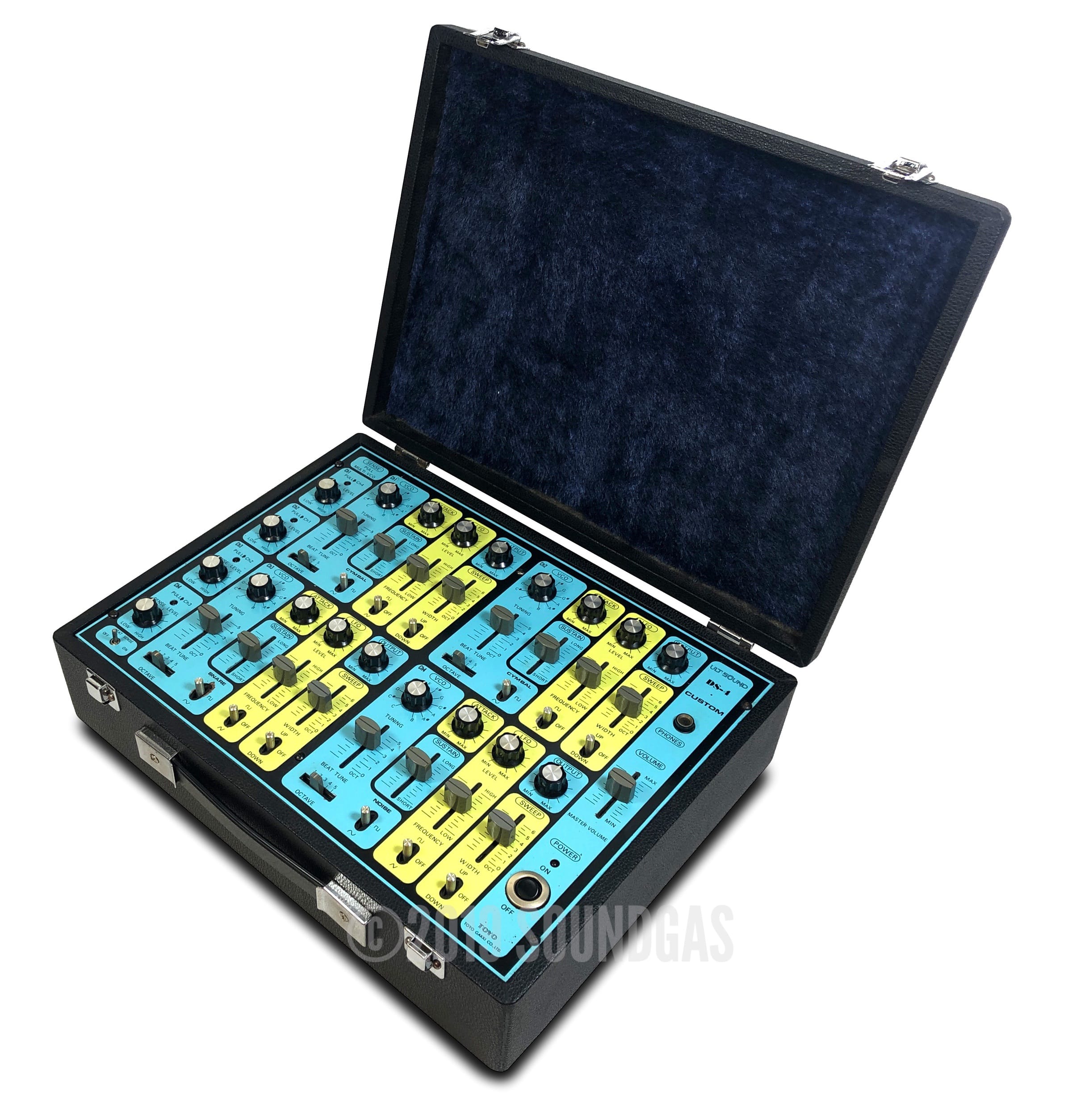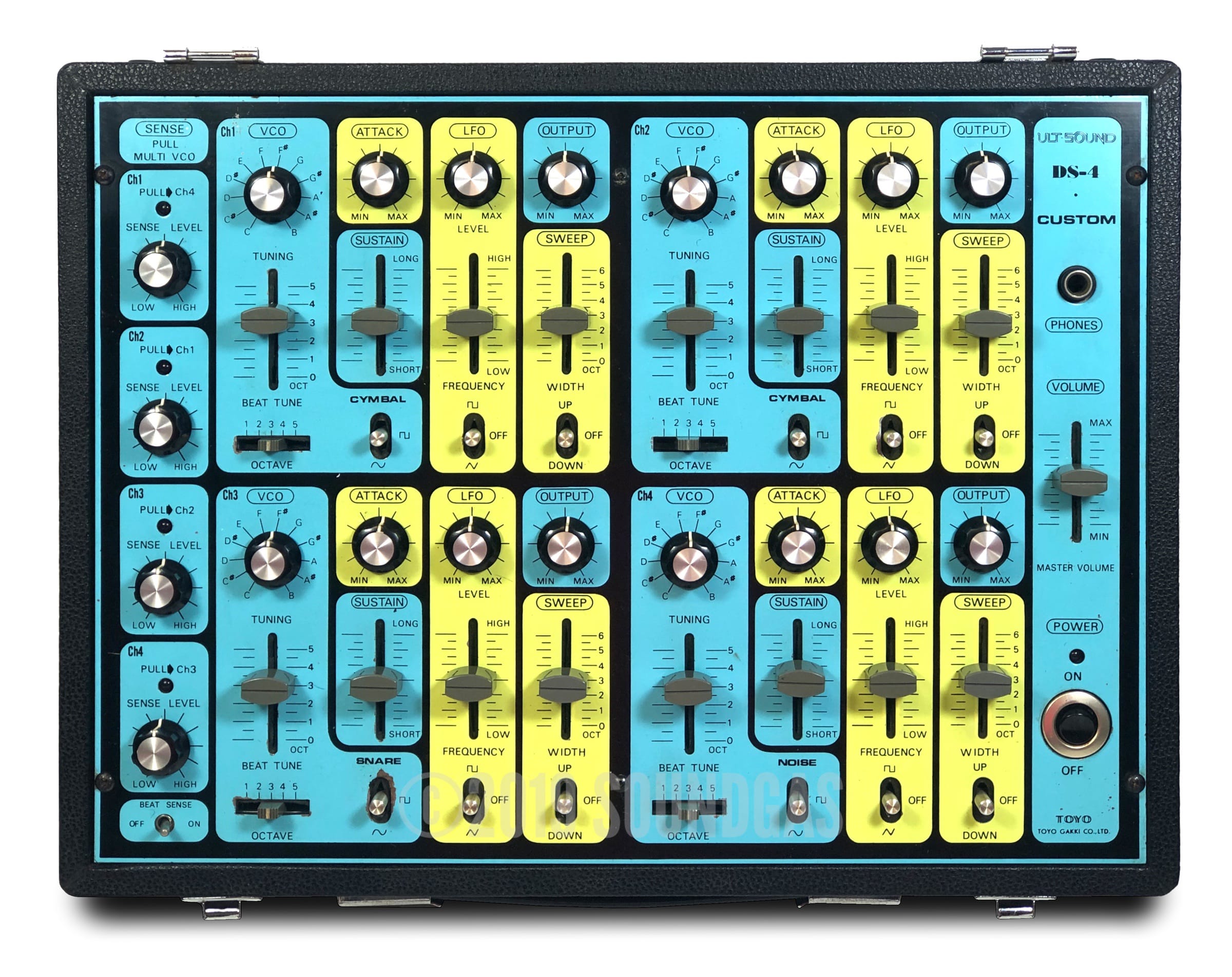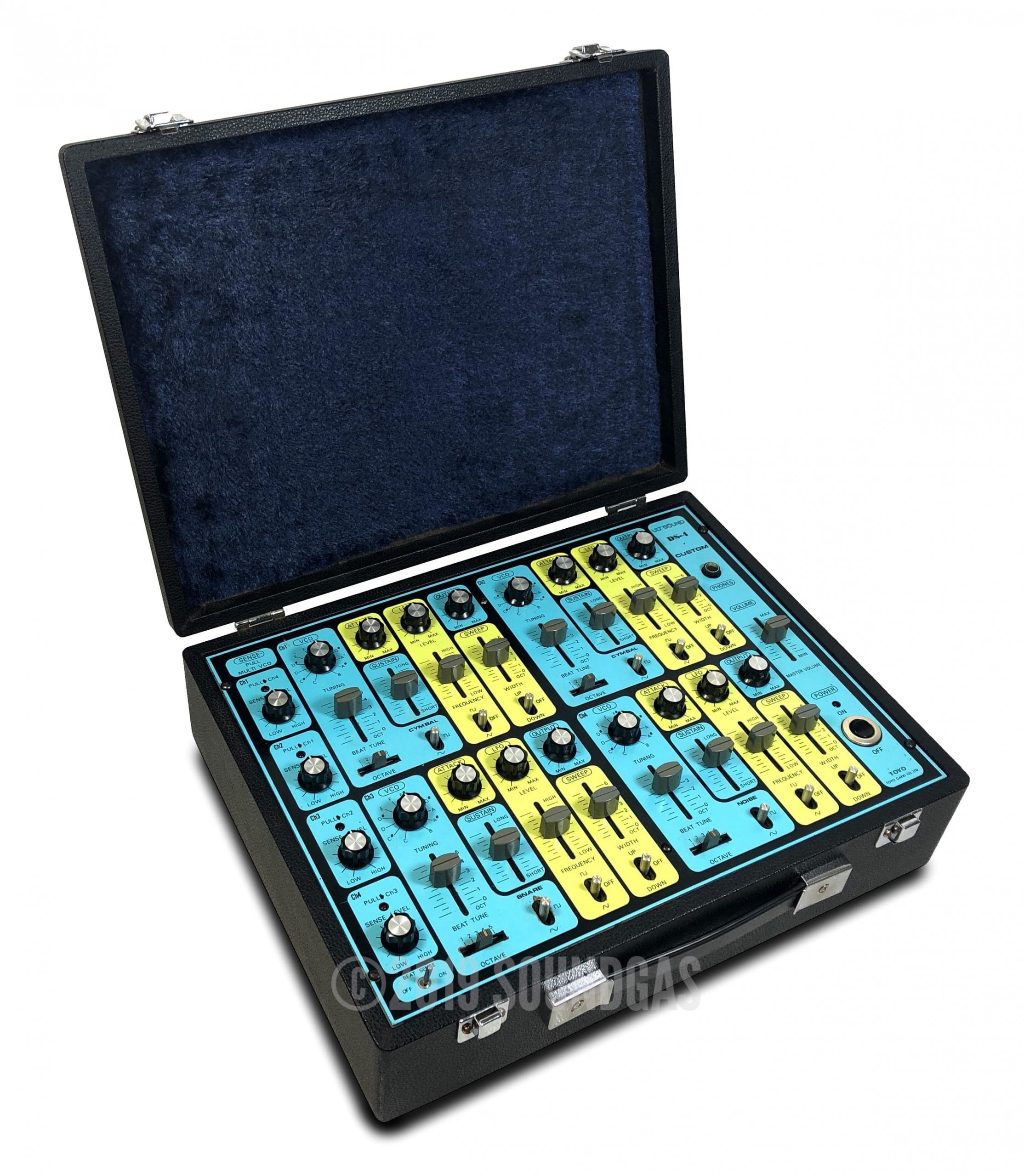 Ultra-rare Japanese 4 channel drum synth with unique cascade triggering option – accessed by pulling individual channel sensitivity knobs.