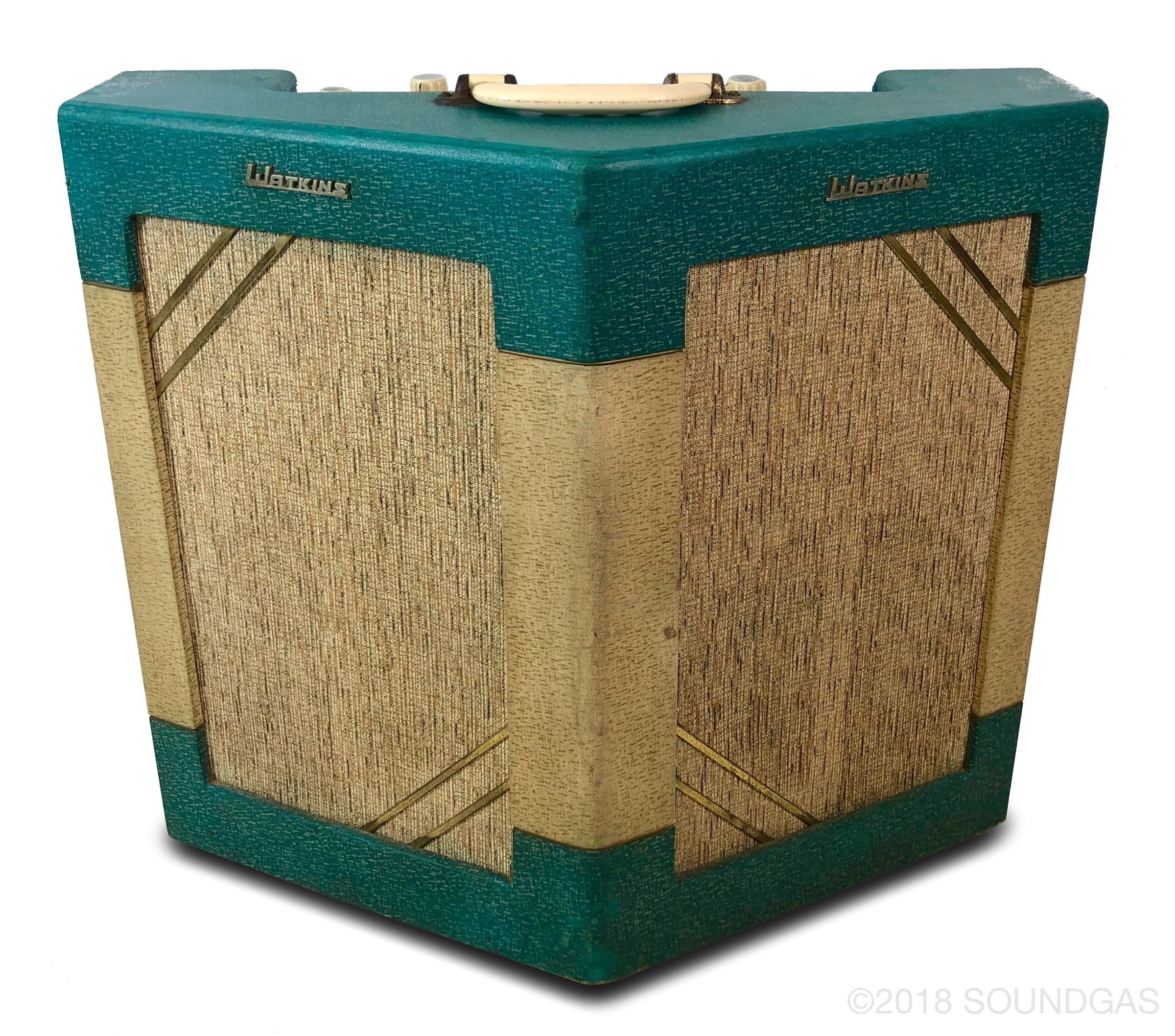 Superb Watkins V-Front Dominator for sale in excellent cosmetic condition and very good working order following a service. Dating from c1963, this amp looks to be all-original internally aside from one period-correct replacement Elac speaker. It has what appears to be a full set of Mullard valves (one is worn where the logo was). These amps sound absolutely huge - stand one behind your Marshall/Vox stack and mic it up....