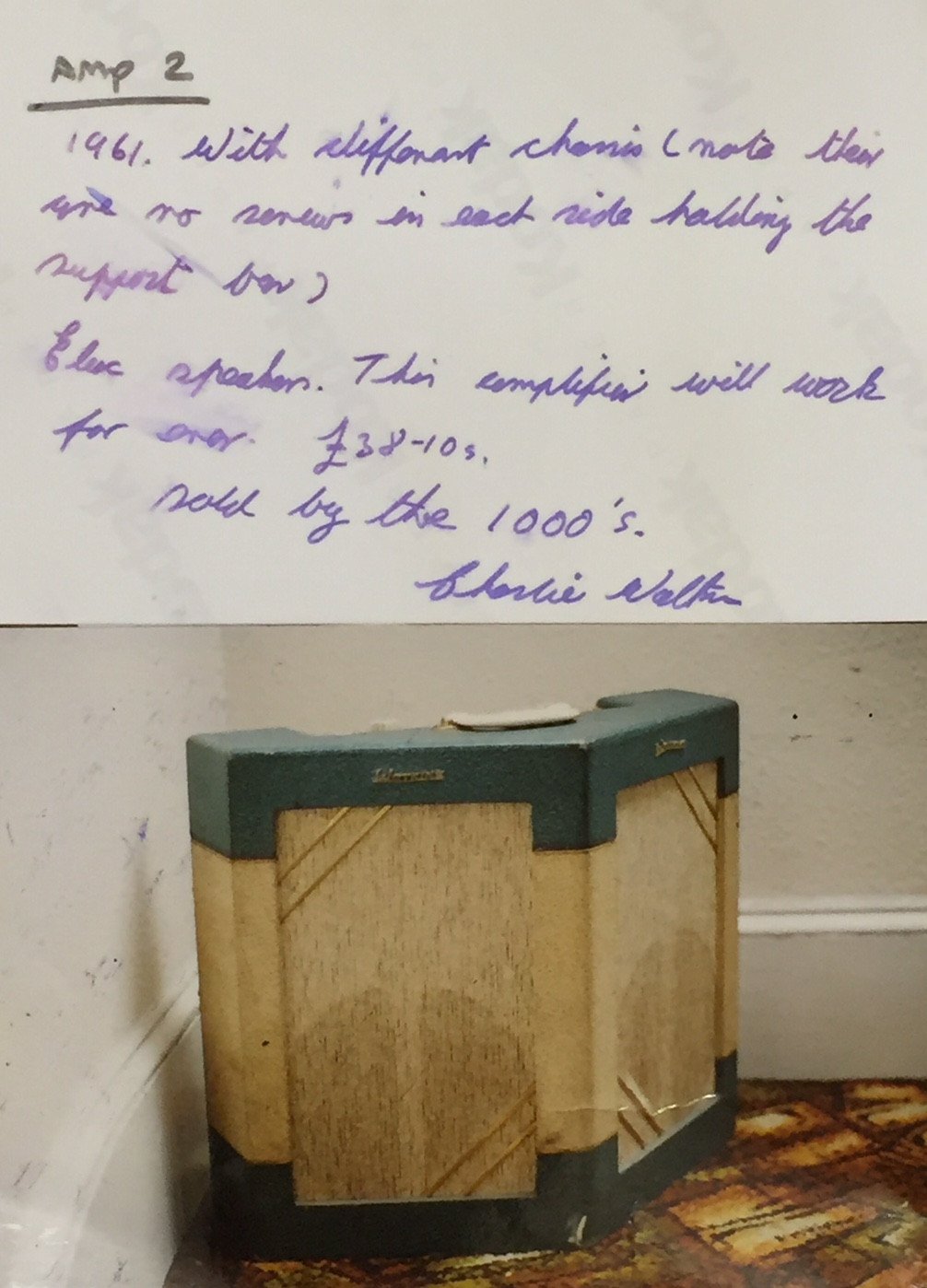 This one comes with a pair of photos, one of which has a handwritten note about this amp from Charlie Watkins himself (see below):