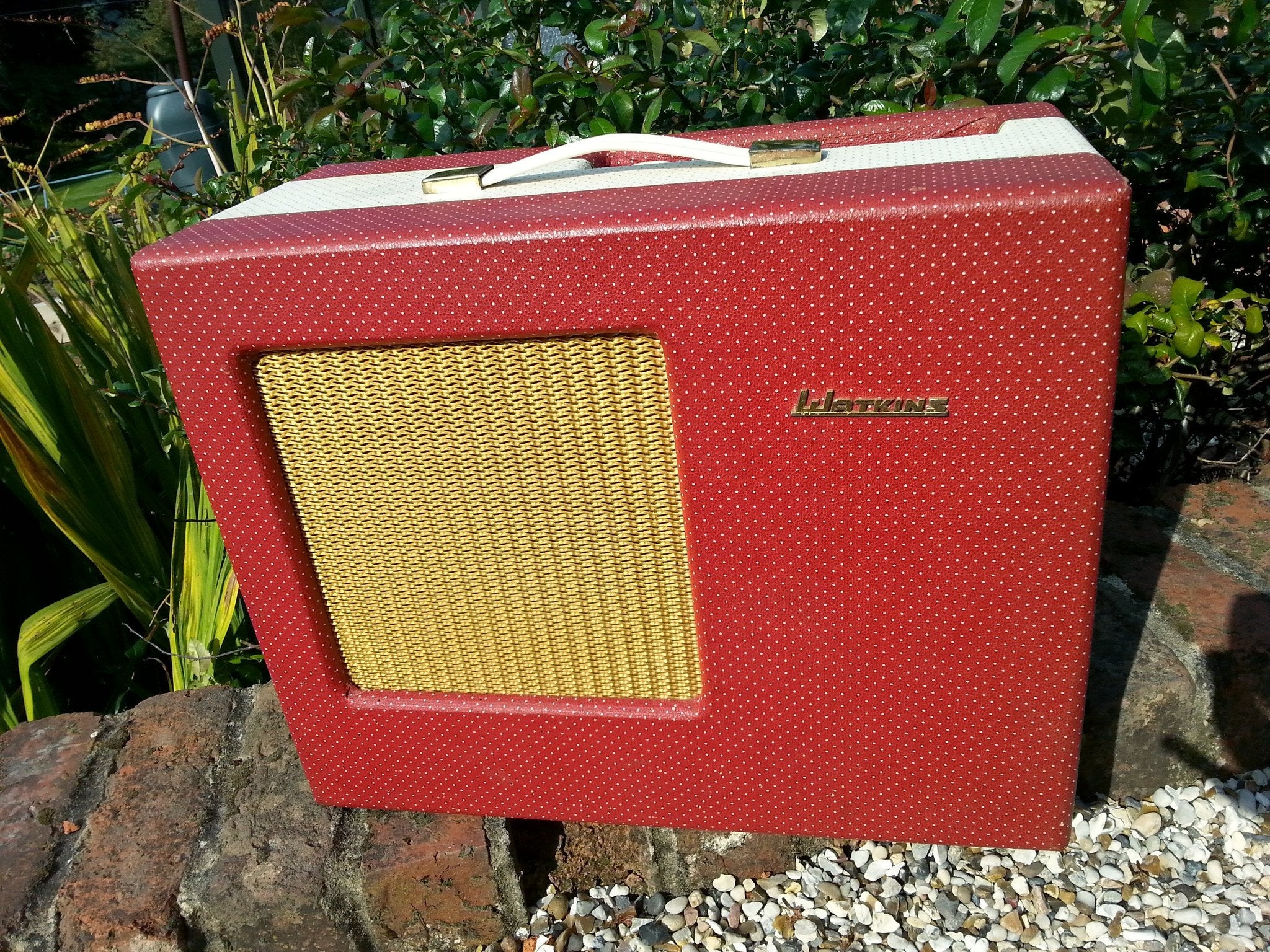 Offered for sale is rare maroon and cream Watkins Westminster valve (tube) amp in exceptional cosmetic condition and perfect working order. This stunning-sounding vintage guitar amp has just had superb rebuild courtesy of Mac Amps with all failing components replaced. Watkins amps of this era are full of failing and out of spec caps: a good rebuild can really transform them into stunning little amps. Everything important is still original and in very good condition; it sports a full complement of original Mullard valves, and has the original Elac speaker and blue footswitch, both in excellent order.